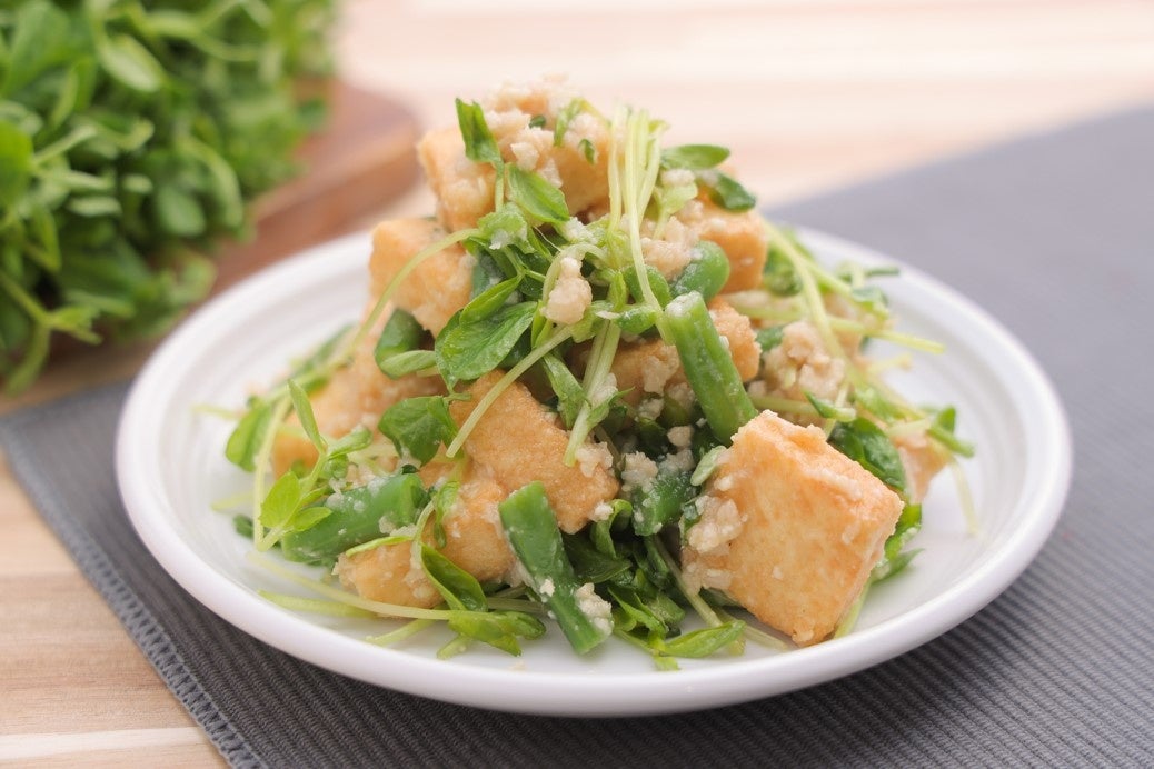 豆苗のシャキシャキ食感と、厚あげのふんわり食感が塩そぼろ餡で絶妙な一体感に。やさしい味わいで、ほっとする一品です。
