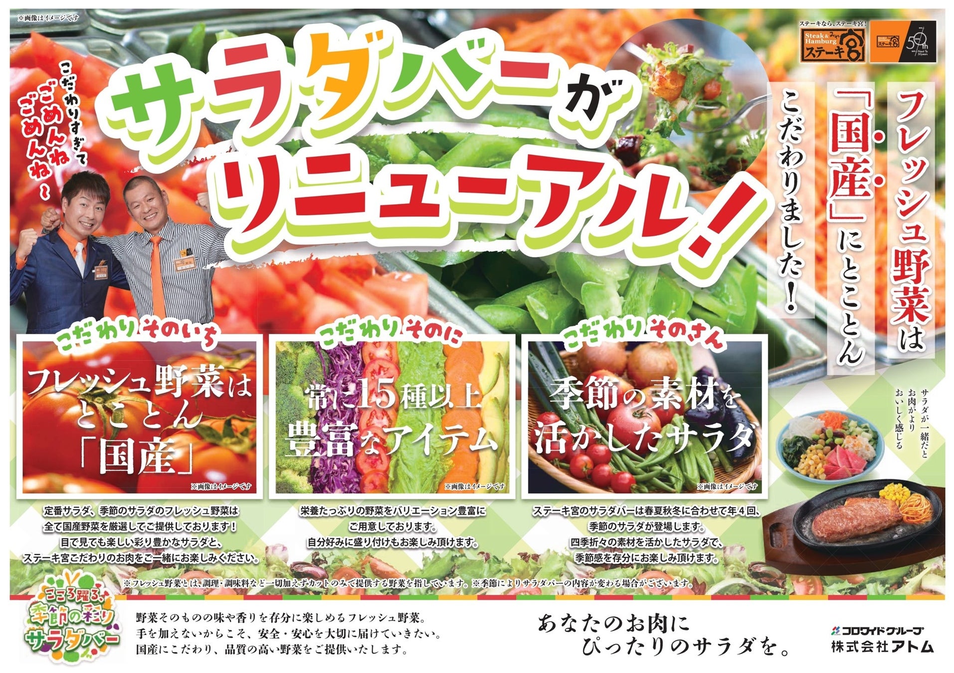 コロワイドグループの株式会社アトム(本社:神奈川県横浜市、代表取締役社長:田中公博)は、ステーキ宮で提供するサラダバーをリニューアル。11月26日(火)から、フレッシュ野菜は全て“国産野菜”を厳選してご提供いたします。(※フレッシュ野菜とは、調理・調味料など一切加えずカットのみで提供する野菜のことを指しています。)