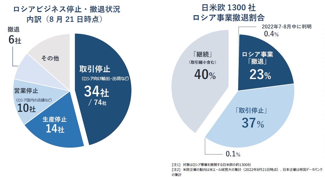 日本企業でも引き続き、ロシア工場の操業停止や同国との製品輸出入停止といった、ロシアと距離を置く動きは続いた。しかし、ロシア事業依存によるレピュテーションリスクは「当初の想定に比べて深刻度は小さい」といった指摘もあり、ロシアビジネス撤退には慎重姿勢をみせる企業が多い。対ロ姿勢は国内でも官民のみならず、グローバル企業と中堅企業でも足並みが揃っておらず、当面はロシア事業の見直しを当面「様子見」する企業が多くを占めるとみられる。
