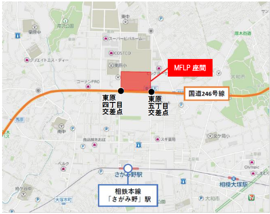 「MFLP座間」は、最寄りの東名高速道路「綾瀬スマートIC」から約4.5kmとアクセスが至便、かつ「横浜町田IC」や圏央道「厚木IC」、国道16号線が利用可能であり、首都圏一帯を様々な道路網でカバーできるだけでなく、都心から全国各方面への輸送効率が非常に高いエリアに位置します。JR線直通の相鉄本線「さがみ野」駅からは徒歩11分と従業者の通勤利便性に優れるほか、周辺人口も多く、雇用確保においても有利な立地です。