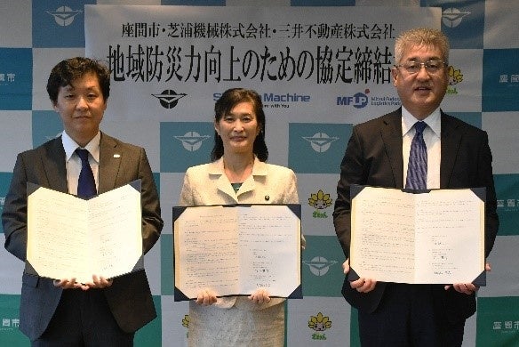 座間市・芝浦機械・三井不動産にて防災協定を9月26日に締結しており、「防災パーク」を地域住民や消防署との防災訓練や、地域の小学校が防災学習をする場として活用いただきます。また、災害時には、防災テントやマンホールトイレが設置されるほか、災害時に炊き出し用かまどとして利用可能なかまどベンチや太陽光発電による電力供給でスマートフォンなどが充電できるベンチも設置されています。