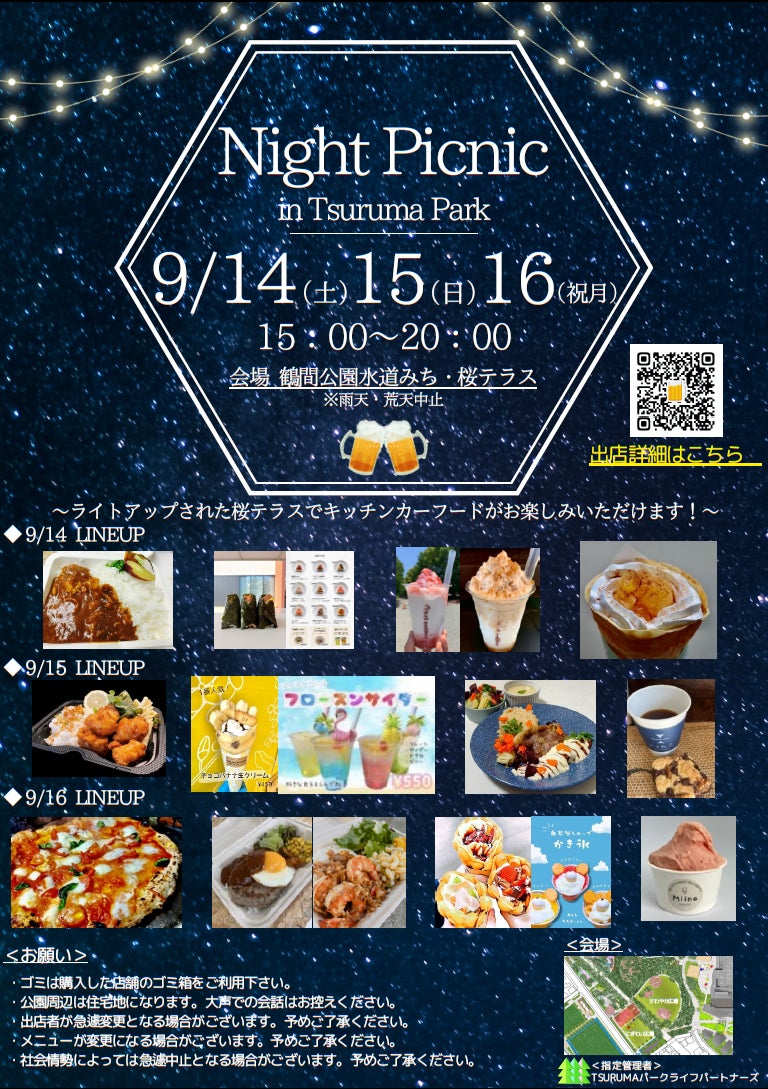「Night Picnic in Tsuruma Park」では、夕涼みの時間帯に町田市を拠点とするフードトラックのキッチンカーフードがお楽しみいただけるほか、「花火体験」や「ミニ縁日」、「星空観望会」など夜ならではの体験イベントを同時開催します。