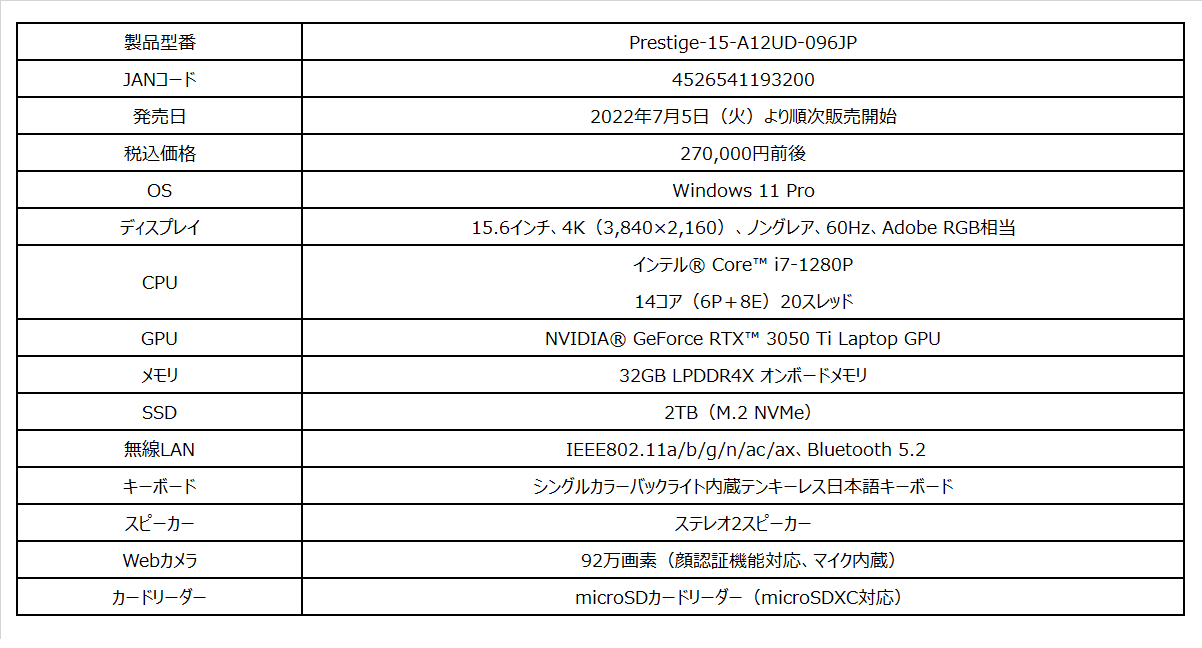 この度、エムエスアイコンピュータージャパン株式会社は、15.6インチタイプ・薄さ18.9mm・軽さ1.69kgの本体に最新の『第12世代インテル® Core™ プロセッサー』と3Dグラフィックスなど映像処理に強い専用グラフィックス機能「NVIDIA® GeForce RTX™ 3050 Ti Laptop GPU」を搭載し、パワフルさと運びやすさを追求したビジネス・クリエイターノートPC「Prestige-15-A12UD-096JP」をMSI公式オンラインストア(以下、MSIストア)限定で2022年7月5日(火)より発売いたします。