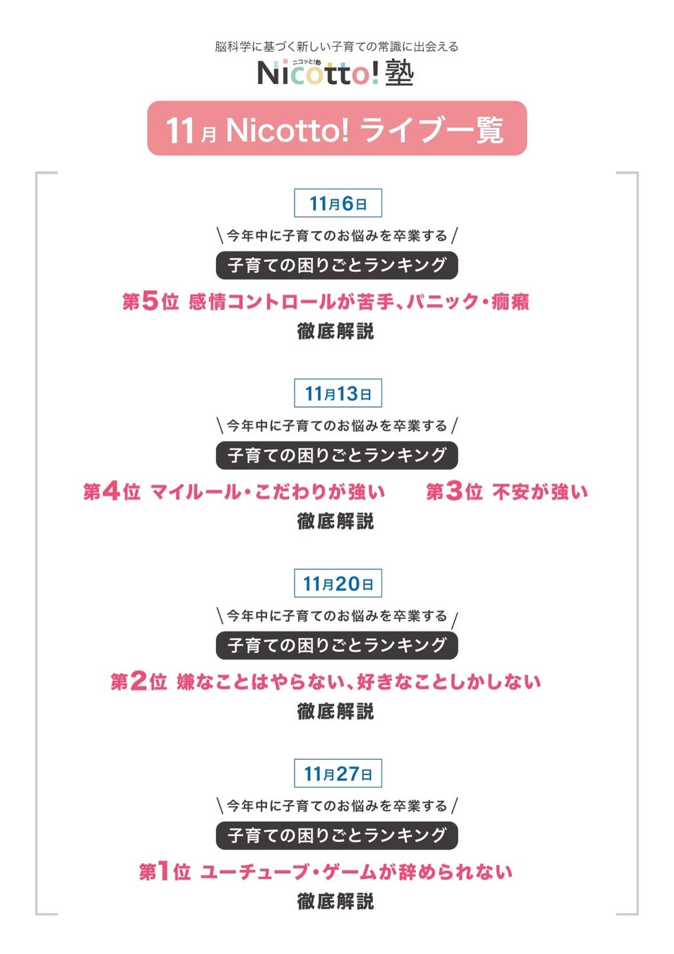 11/6「\今年中に子育てのお悩みを卒業する/子育ての困りごとランキング第5位 感情コントロールが苦手、パニック・癇癪 徹底解説」