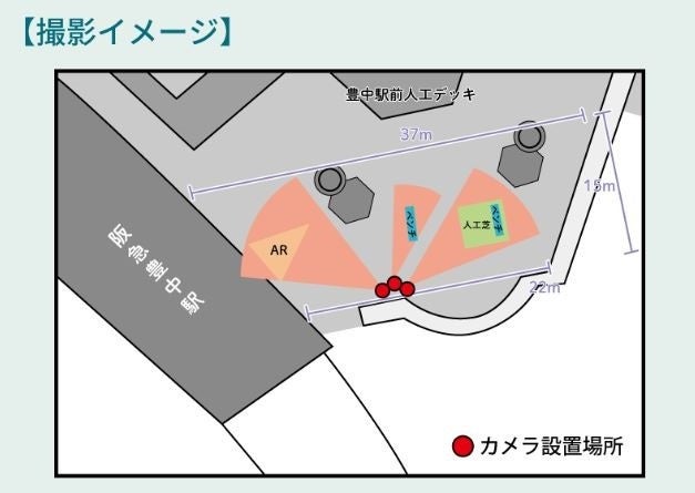 今回のプロジェクトでは、将来に向けた豊中駅前の賑わい創出に関する実証実験として、株式会社スピード(本社:愛知県瀬戸市)と協働し、豊中駅前人工デッキに人工芝やスマートフォンでAR※を用いた写真撮影ができる2次元コードを設置します。今までになかった上記のような仕掛けによって、人流の変化を生みだし、その状況を人流解析カメラで撮影し、データを解析することで、駅周辺の賑わい創出の在り方を検証します。また、実施期間中は人工芝等を設置しない日も設け、設置した日との差を測ります。