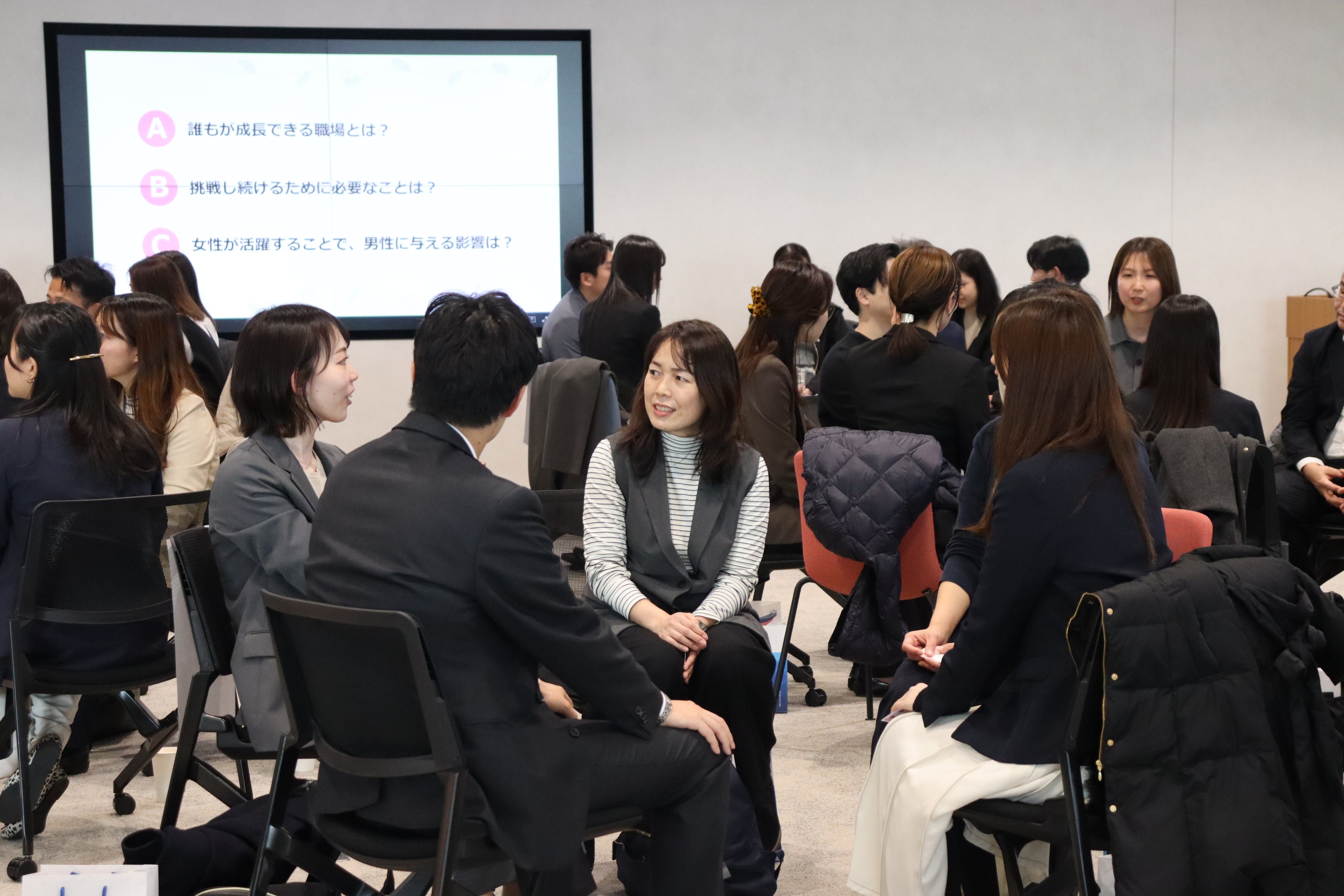 第2部のDE&Iリーダーズセッションでは、両社で活躍する女性上級職2名が登壇し、キャリアをテーマにパネルディスカッションを行いました。また、第3部の最終プログラムでは参加者による対話会を行い、少人数のグループに分かれて女性活躍推進やDE&Iについての意見交換を行いました。