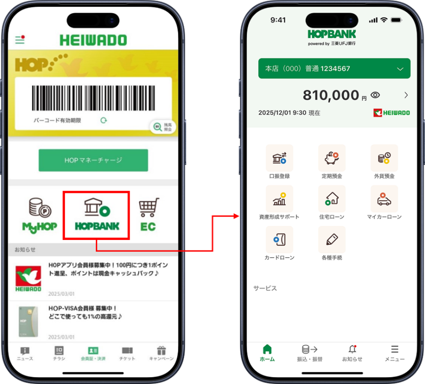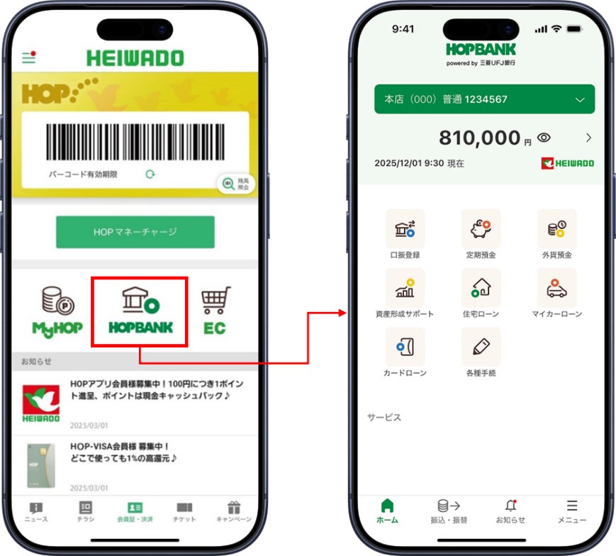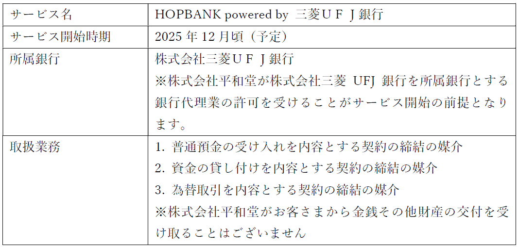 株式会社平和堂(代表取締役 社長執行役員CEO 平松(ひらまつ) 正嗣(まさし)、以下 当社)と、株式会社三菱UFJ銀行(取締役頭取執行役員 半沢(はんざわ) 淳一(じゅんいち)、以下 三菱UFJ銀行)は、2025年12月にスーパーマーケット業界初(*1)となる銀行サービス「HOPBANK powered by 三菱UFJ銀行(以下HOPBANK)」を開始予定であることをお知らせいたします。