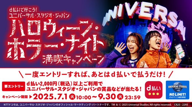 株式会社NTTドコモ(以下、ドコモ)は、全国の街のお店・ネットのお店※1で「d払い®」※2をご利用したお客さまを対象に、「ユニバーサル・スタジオ・ジャパン1デイ・スタジオ・パス(ペア)」や「dポイント(期間・用途限定)1,000ポイント」が抽選であたる「d払いで行こう︕ユニバーサル・スタジオ・ジャパン ハロウィーン・ホラー・ナイト 満喫キャンペーン」(以下、本キャンペーン)を2025年7月1日(火)から2025年9月30日(火)までの期間で開催いたします。