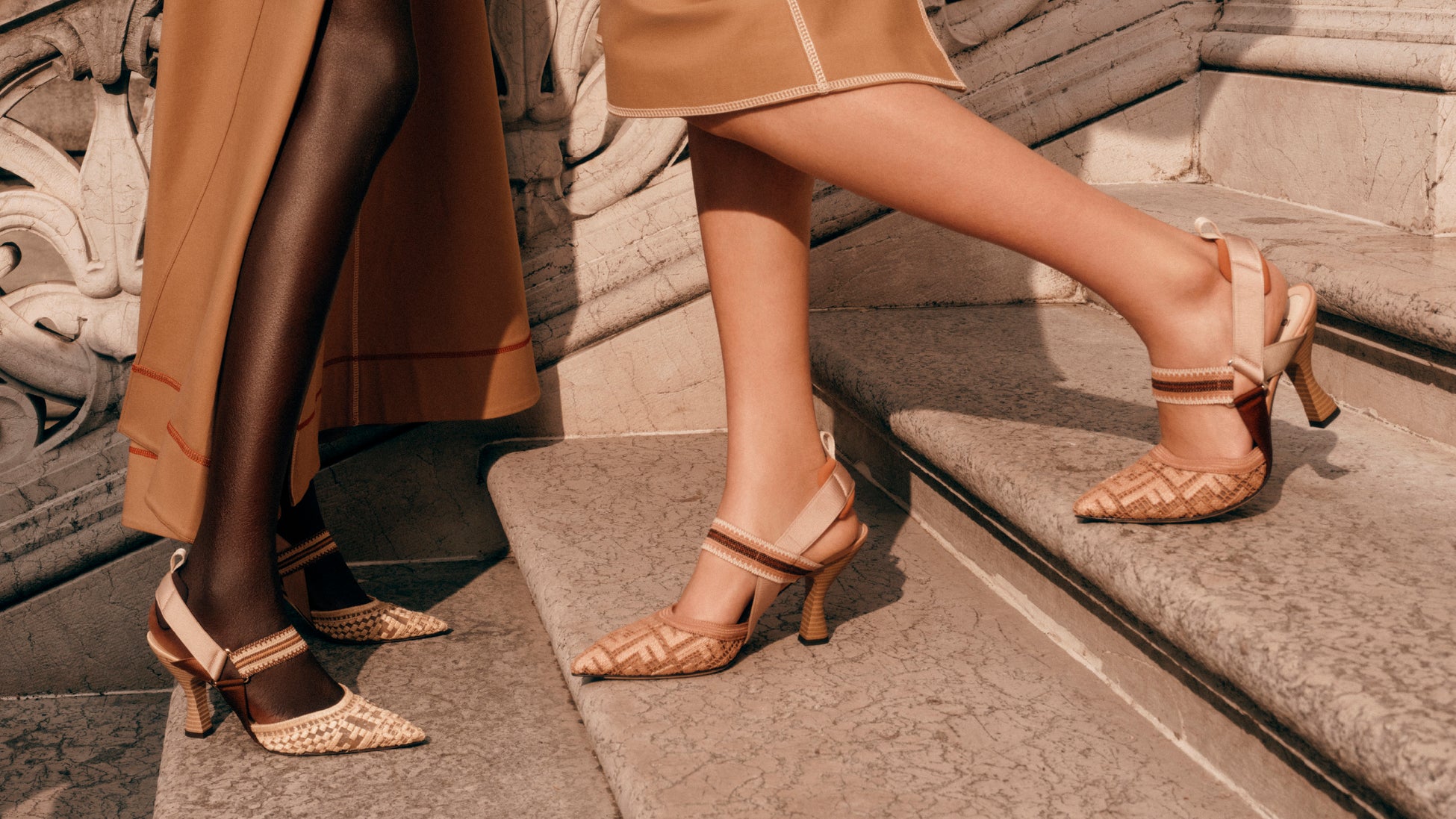 燦々と照り付ける太陽の光に包まれたローマの夏を彷彿とさせるフェンディ 2025年サマーコレクションには、鮮やかなカラーパレットと“マスター オブ マテリアル”にふさわしい素材が揃います。涼しげなメッシュの下地には、フェンディの職人技が結集したラフィアの「FF」ロゴエンブロイダリーや、同系色の「FF」ロゴと「ペカン(Pequin)」ストライプのコンビネーションに、ラインストーンの煌めくアクセントが添えられたヘリテージパターンのパッチワークが施されています。より華奢な5.5cmヒールの「コリブリ ライト(Colibri Lite)」は、今シーズンを代表する繊細なバンダナパターンと、マルチカラーで仕上げられた「FF」ロゴのエンブロイダリーがラインナップします。