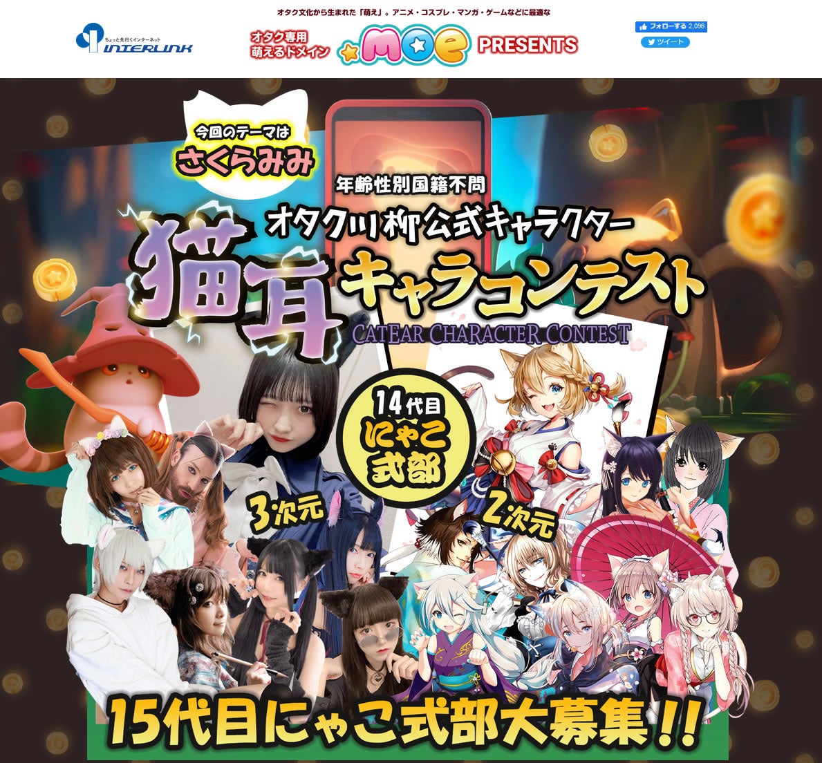 ドメイン「.moe」、「.osaka」、「.earth」の運営や上級者向け(使う人のあまりいない)の特殊な(微妙な)サービスを提供する、インターネットサービスプロバイダーの株式会社インターリンク (東京都豊島区、代表取締役社長:横山正)は、第15代目の「にゃこ式部」を決める「猫耳キャラコンテスト」の応募受付を10月10日午前11時より開始致しました。