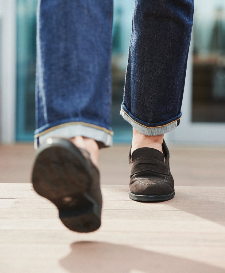 ビジネスカジュアルのスタイルで万能に活躍するコインローファー。「柔弥」は格別の快適さに加え、「三陽山長」のマスターラスト「R2010」をベースに製作した木型「R2021CF」を採用することでエレガントさも高めています。日本人のために作り込んだ設計ゆえフィット感のよさも際立ち、踵が抜けるなどローファーにありがちな悩みも解消。日常使いはもちろん、優れた軽快感で出張時にも重宝するシューズです。また、表革よりカジュアル感の高い「柔弥」のダークブラウンスエードは、ジーンズやチノパンなどと合わせてもマッチする汎用性の高い一足。仕事にも休日にも使えるオンオフ兼用シューズをお求めの方におすすめのモデルです。働き方の変化によりカジュアルのシェアが高まる昨今のワードローブ事情にもフィットするシューズです。