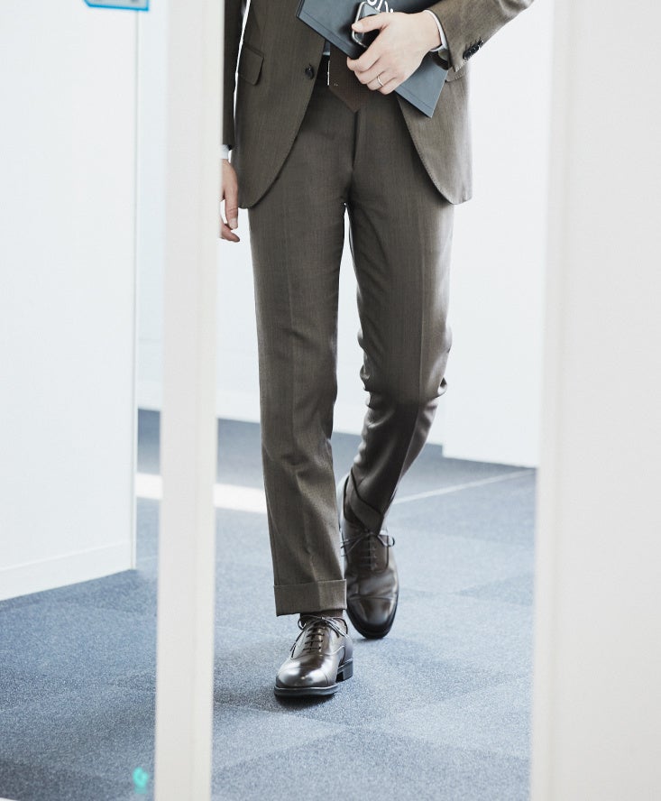ビジネスシューズの基本といえるストレートチップ。「柔二」のブラックはスニーカーのように快適な履き心地でありながら、フォーマルな場面まで通用するドレス感も持ち合わせているのが特徴です。ネイビースーツに白シャツ、紺タイといった正統派のドレスアップスタイルに合わせれば、重要な商談や会議、社内行事にもふさわしい品格あるスタイルに仕上がります。また、同じデザインでもアッパーの色が違えば印象もガラリと変わり、「柔二」のダークブラウンはブラックに比べて柔和な印象になり、小粋なお洒落感を演出することができます。紺やグレースーツを着るほどかしこまらなくてもいいけれど、キリッとした気分は表現したい社内勤務の日などにぴったりです。