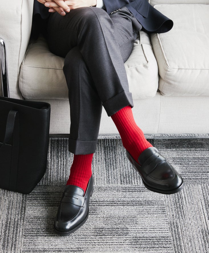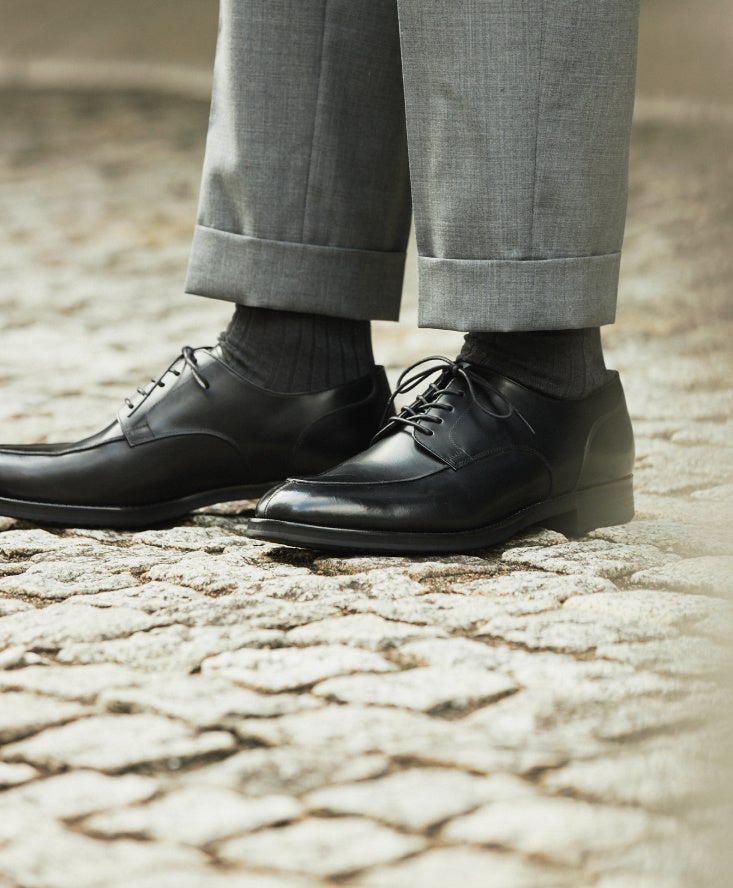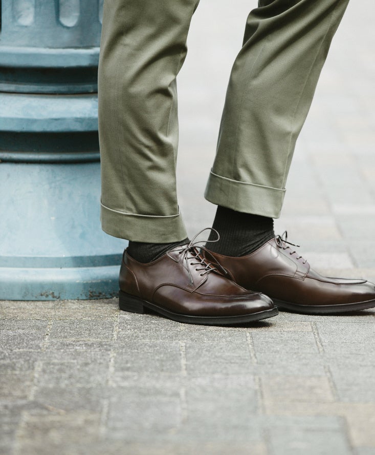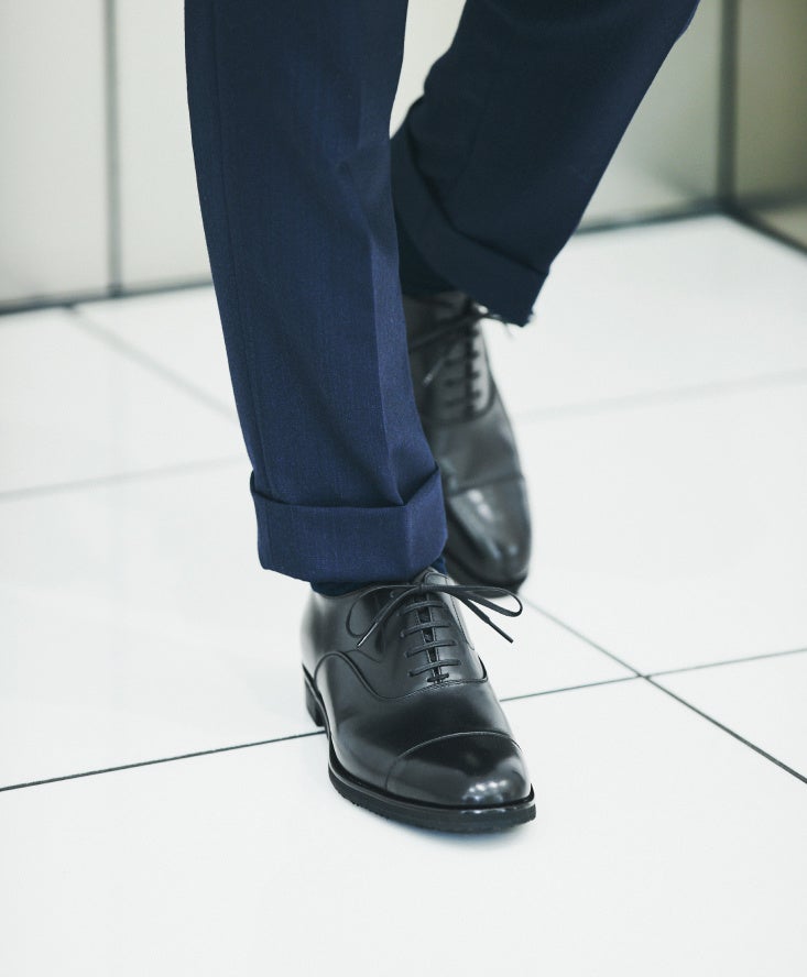 「三陽山長」ではストレートチップと並ぶ定番デザインとして人気のUチップシューズ。甲周りにボリューム感が生まれる外羽根式のため、足元の存在感がアップするのが特徴です。クールビズスタイルに合わせる靴としてもぴったりで、ジャケットを着用しないシンプルな装いも洒脱な印象に。軽快さを追求した履き心地ながら、装いに風格をまとわせてくれる一足です。また、シャープなブラックに比べ、ダークブラウンはトラッドな趣が魅力です。ベージュやカーキなど、アースカラーのコットンパンツに合わせると非常に美しいバランスに。カジュアルシフトによってビジネススタイルの幅が広がった今、ワードローブに備えておけば着こなしの幅を広げてくれる一足です。
