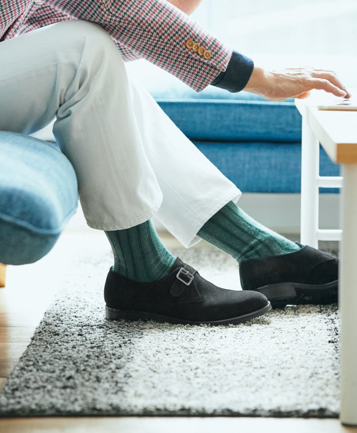 1980年代にフレンチトラッドのアイコンとして人気を博し、近年リバイバルを果たしたシングルモンクストラップ。すっきりとシンプルなデザインでありながら、着こなしに適度なアクセントを加えてくれるのも特徴です。現在の市場にはグッドイヤーウェルト製法による堅牢なシングルモンクが多い中、コンフォート仕立ての「柔八」は他にない魅力を放ちます。また、ブラックスエードのシングルモンクシューズは、表革より柔和でありながら茶スエードよりクールな印象に。ホワイトデニムやチェックジャケットといったカジュアル感のある装いにも良く合います。例えば、昼過ぎまで近くのカフェでリモートワークをこなし、午後遅めから少しだけオフィスへ……といったハイブリッドな働き方にもマッチする一足です。