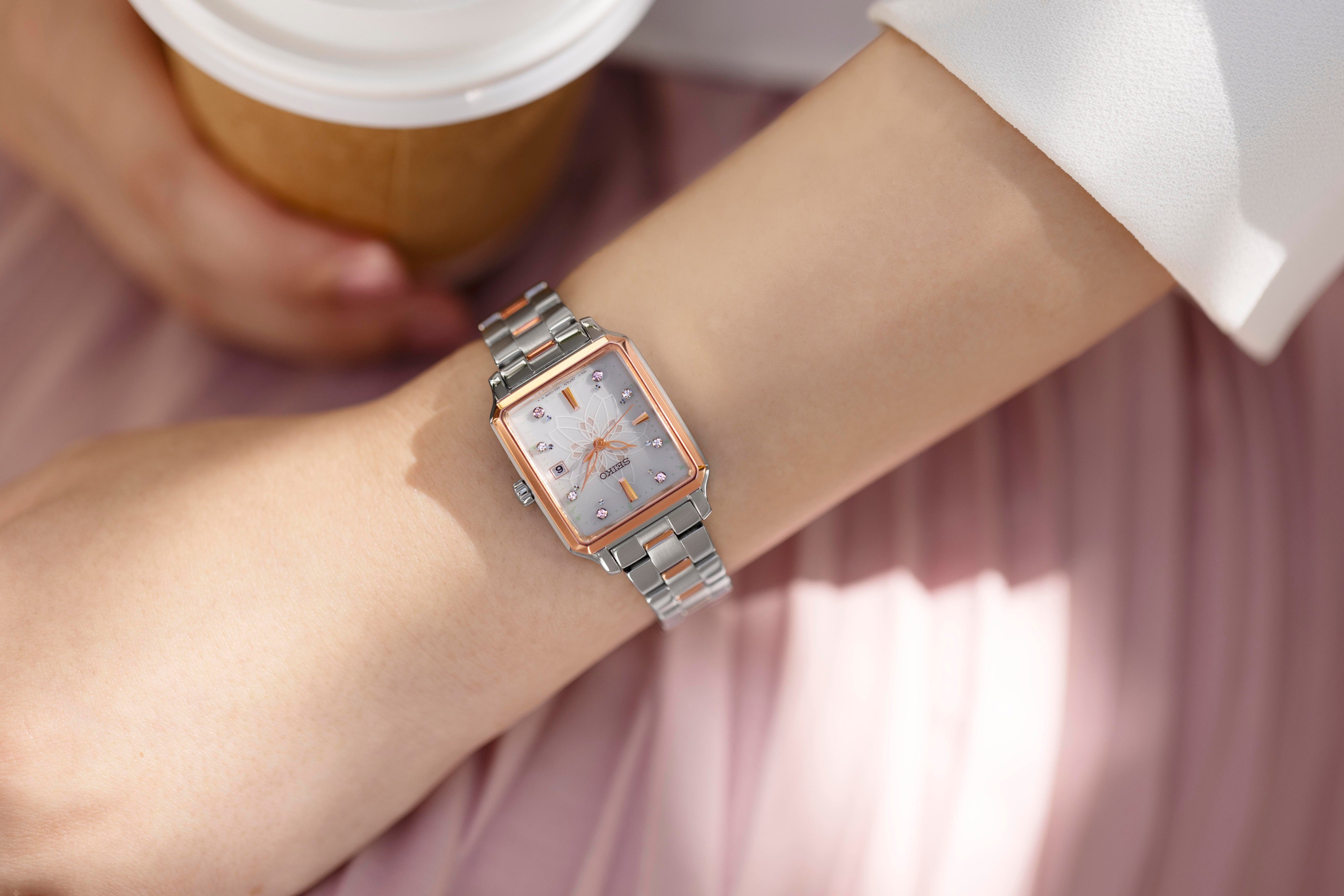 丸型のSSQW080とトノー型のSSVW226は共に、花びらが開く様をイメージした繊細で伸びやかな桜のモチーフを、白蝶貝のダイヤルにデザインしています。SSQW080には美しく輝くラボグロウン・ダイヤモンドを6石、SSVW226には桜を思わせるような淡いピンクカラーと透明のクリスタルガラスを8個あしらいました。