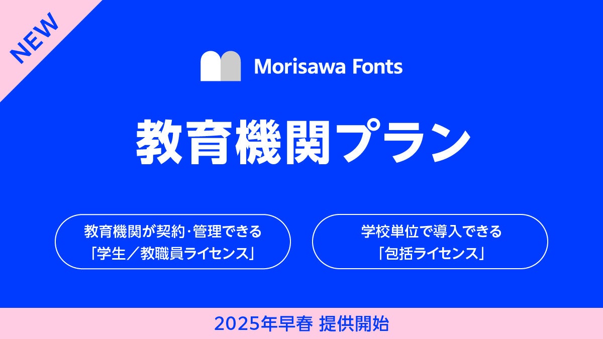 株式会社モリサワは、「教育機関向け MORISAWA PASSPORT」の後続製品として、フォントサブスクリプションサービス「Morisawa Fonts」の教育機関向けプランの提供を、2025年早春から開始します。共有の設備PCにフォントを導入できる「設備ライセンス」に加えて、この度、学生や教職員PCのフォントを教育機関が管理できる「学生ライセンス」「教職員ライセンス」、学生や教職員、学内設備PCのフォントを学校単位で導入できる「包括ライセンス」といった新たなライセンスを拡充します。