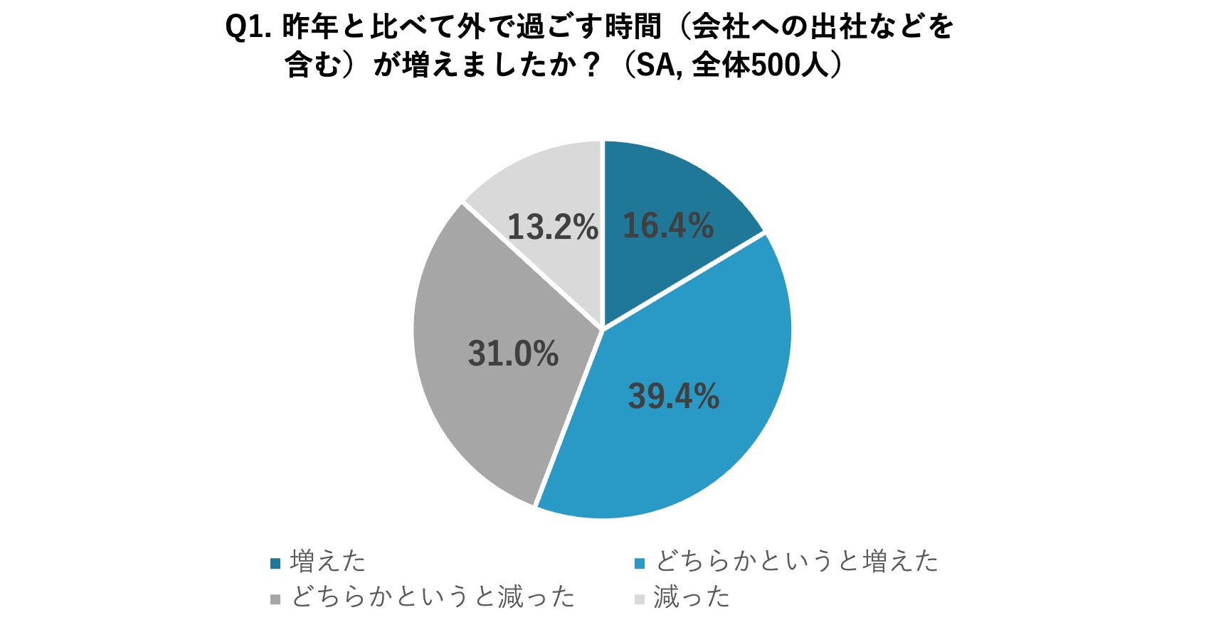 調査対象の20〜50代の女性に対して、新型コロナウイルス感染防止による外出規制があった昨年の同時期と比べて、外で過ごす時間が増えたかどうかについて聞いたところ、全体の5割以上(55.8%)が「増えた」、「どちらかというと増えた」と回答。