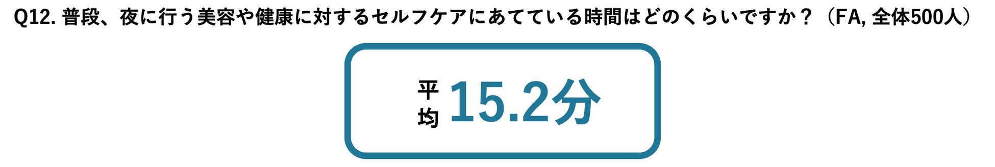 ⑤夜のセルフケア“夜間美容”にあてている時間は「平均15分」と判明。30代では平均を大幅に下回る結果に。夜間のヘアケアを行っている人は4人に1人未満と、見た目における髪の重要度に比べ低い結果に。