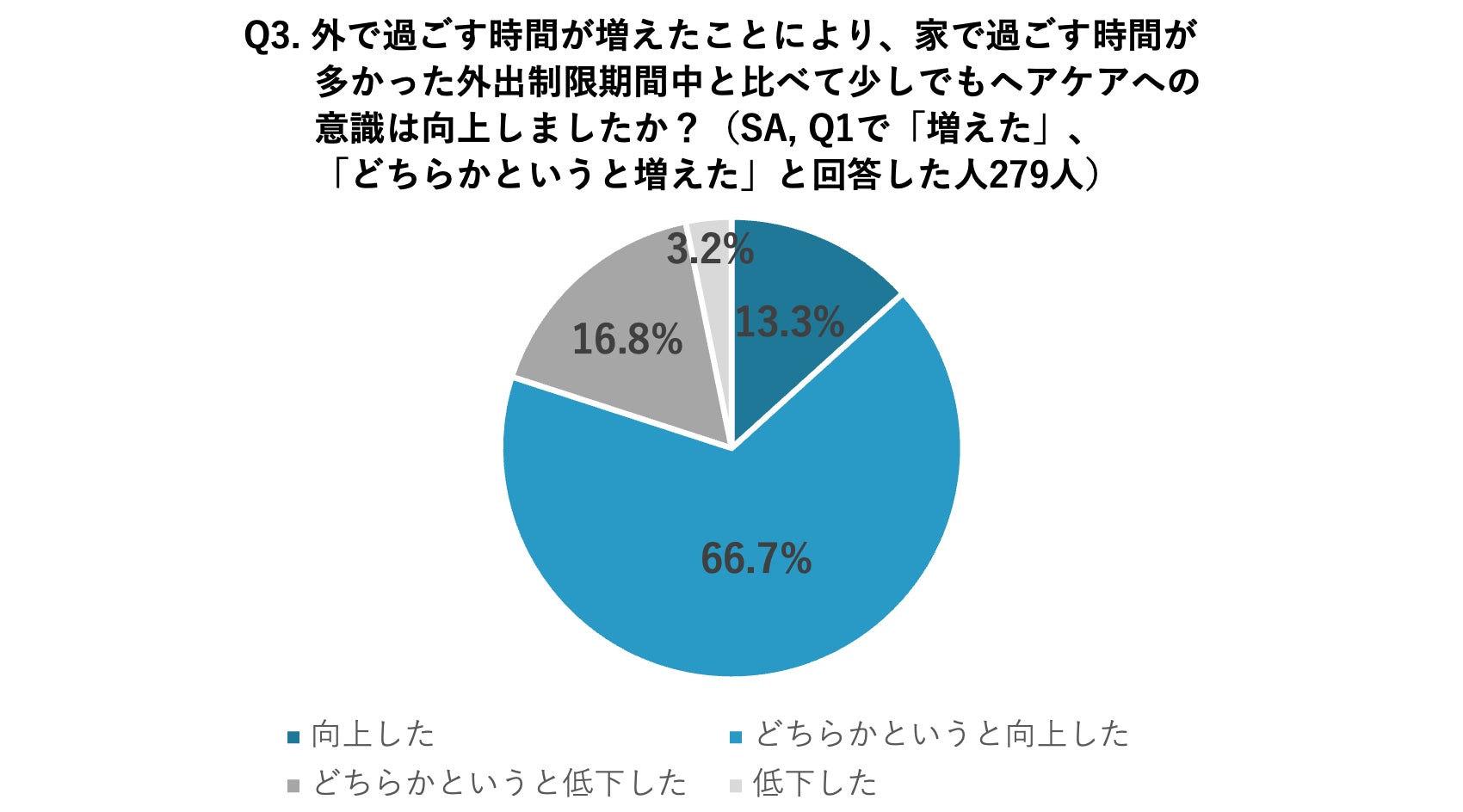 - 約80%が外で過ごす時間が増えたことにより、ヘアケアへの意識が向上したと回答。また、全体の80%以上が髪の状態が良い場合自分に自信が持てると回答。