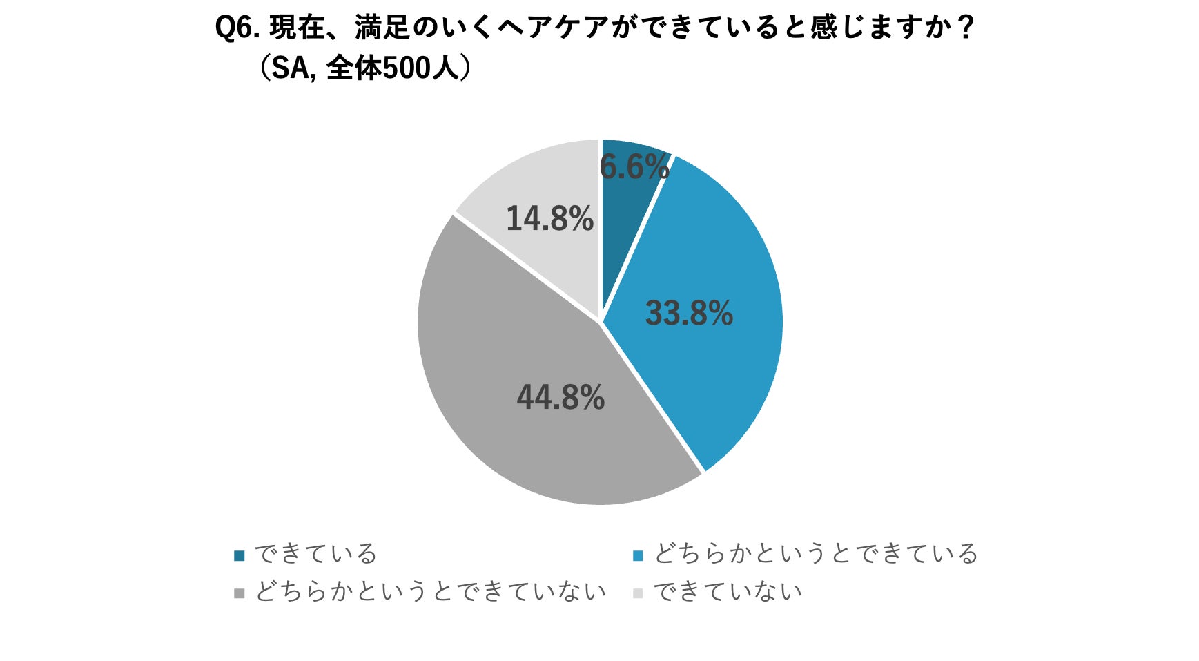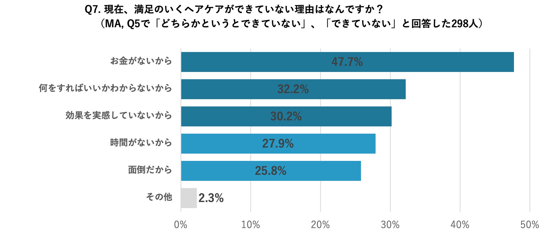 満足のいくヘアケアができていない人に対して理由を聞いたところ、「お金がないから」、「何をすればいいかわからないから」、「効果を実感していないから」がTOP3にランクイン。30代においては、他の年代と比べて「時間がないから」という回答が多い傾向に。