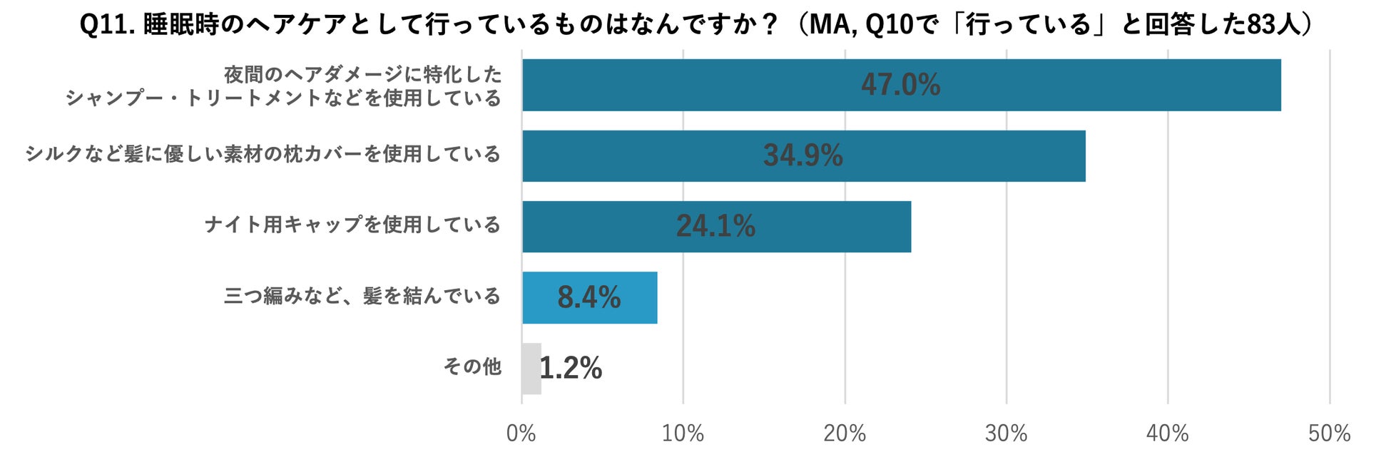 また、睡眠時のヘアケアを行っている人の中では、「夜間のヘアダメージから髪を守るシャンプー・トリートメントなどを使用している人」が約半数(47%)と最も多い結果に。