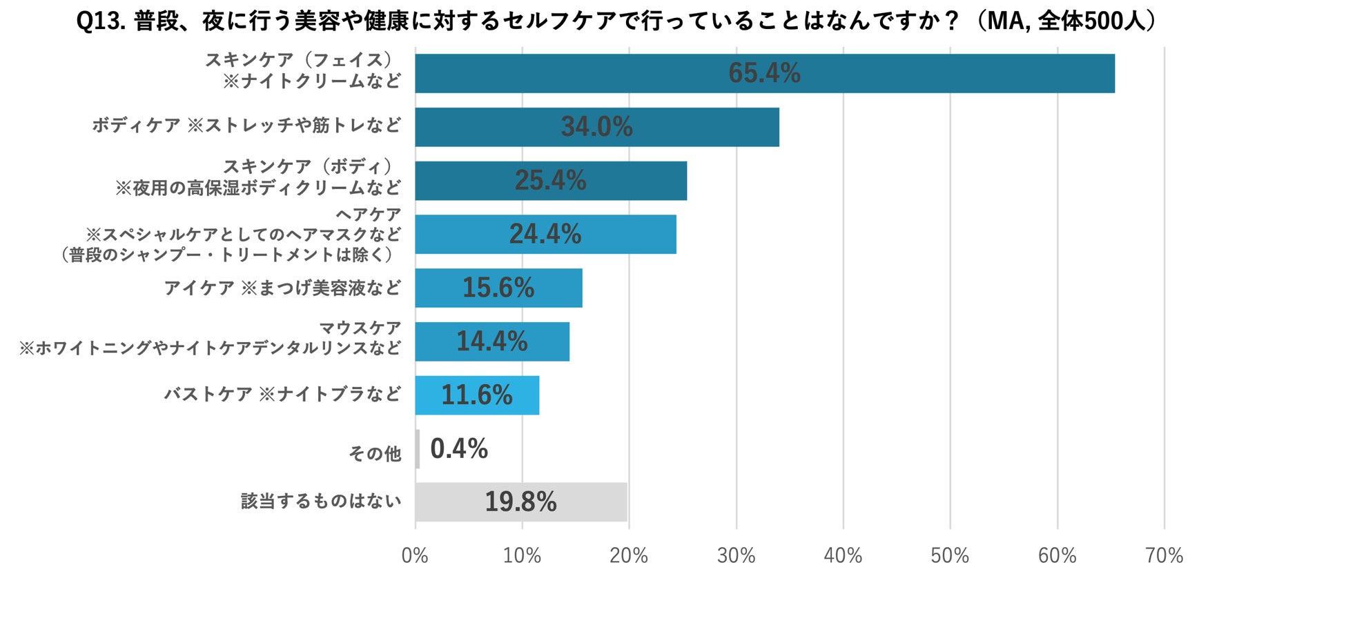 - 夜のセルフケア“夜間美容”にあてている時間は「平均15分」と判明。30代では平均を大幅に下回る結果に。夜間のヘアケアを行っている人は4人に1人未満と、見た目における髪の重要度に比べ低い結果に。