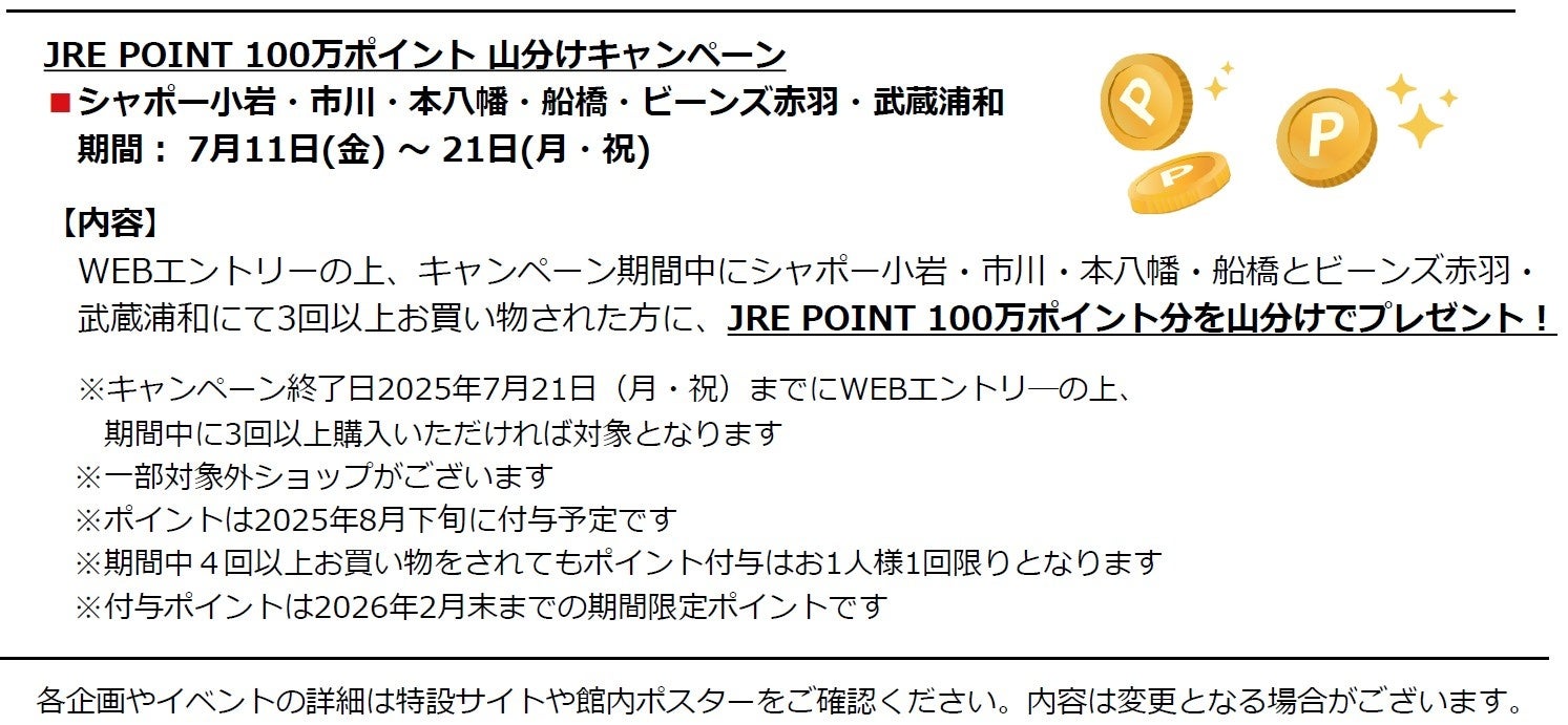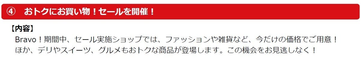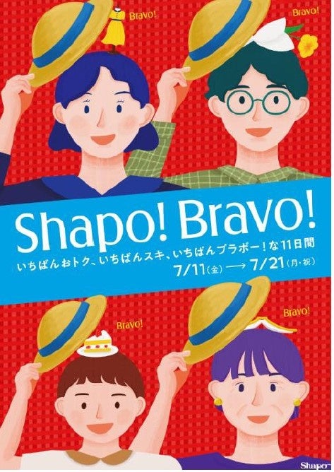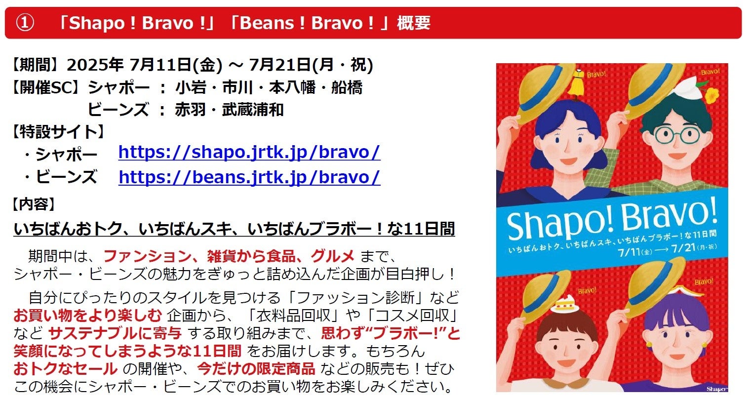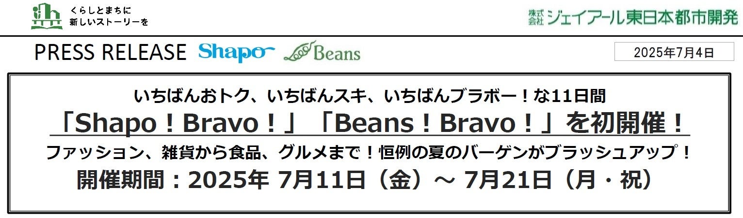 株式会社ジェイアール東日本都市開発が運営するシャポー・ビーンズでは、恒例の夏のバーゲンを名称変更し、ブラッシュアップさせた新たな取り組みとして「Shapo!Bravo!(シャポー!ブラボー!)」および「Beans!Bravo!(ビーンズ!ブラボー!)」を、2025年7月11日(金)から7月21日(月・祝)まで初開催します。期間中は、ファッション、雑貨から食品、グルメまで、“いちばんおトク、いちばんスキ、いちばんブラボー!”をテーマに、お買い物をより楽しんでいただけるような企画やキャンペーンを行います。今までのクリアランスセールだけのバーゲンにはなかった、シャポー、ビーンズの魅力がぎゅっと詰まったワクワクする11日間をどうぞお楽しみください。