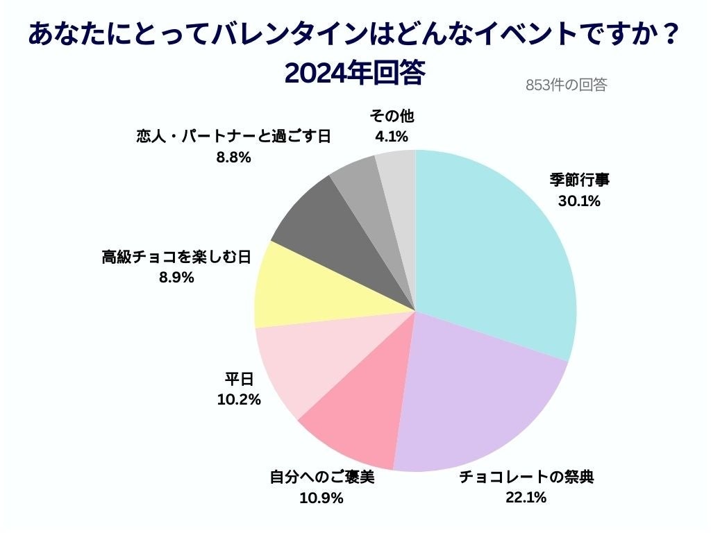 「あなたにとってバレンタインはどんなイベントか」とのアンケートに2023年は「感謝を伝える大切な日」「愛を伝える大切な日」という回答が多かったのに対し、2024年は「チョコレートの祭典」に次いで「自分へのご褒美の日」がランクイン。バレンタインはもはや自分のためのイベントにシフトしてきている傾向がみられました。他にも「推し活を楽しむ日」という回答も。