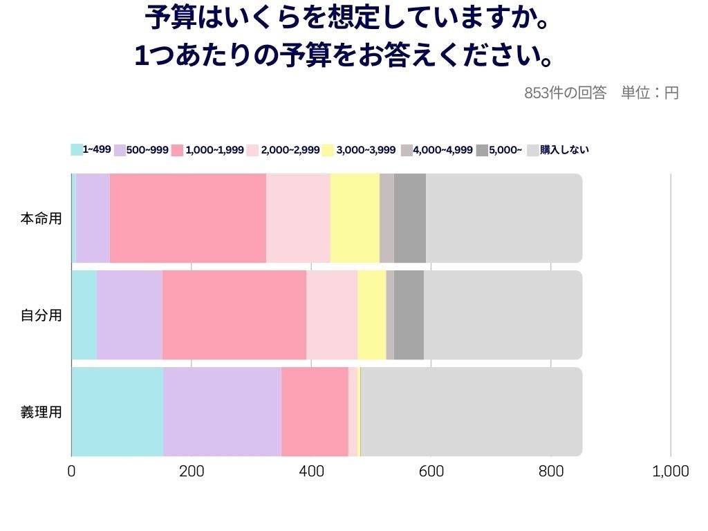 バレンタインにかける予算は本命と自分用が第1位「1,000~1,999円」と一緒の結果に!
