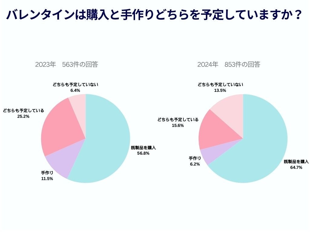 今年は既製品・市販品を購入すると回答した方が昨年よりも7.9ポイントアップ。一方で「手作りもするし購入もする」と回答した方は9.6ポイントダウン。アフターコロナによりお店で購入したいと思う方が多く、既製品購入を希望される方が増えているようです。
