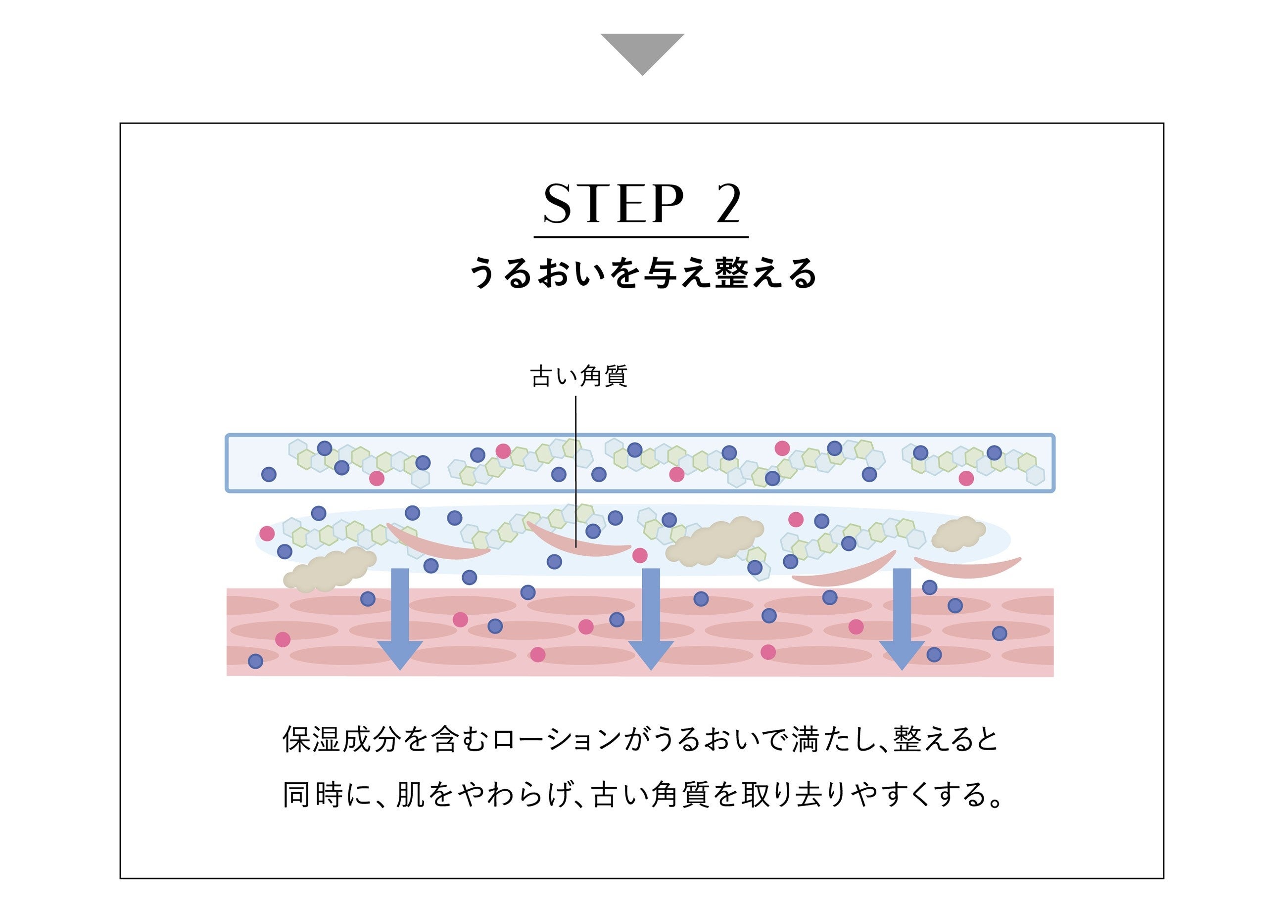 保湿成分配合のローションで、肌をうるおいで満たしながら整え、磨き上げるようにふき取ります。