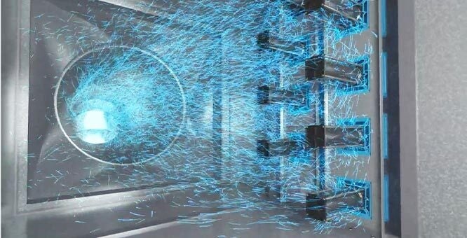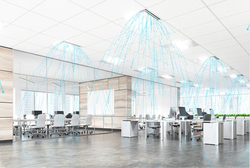 独自の低温プラズマ放電技術により発生する活性酸素や活性窒素を含む長寿命なイオンにより、菌やウイルスを99.9%除菌します(※2)。発生したイオンは壁や机上まで効力を保持して届くため、空気中だけでなく物体表面の菌やウイルスにも有効です(※2)。また、既設の空調ダクトに本体を取り付けて建物の空調システムと連動することでイオンを室内全体に拡散させるため、1台で最大約840㎥(※3)まで対応可能で、オフィスや大型の商業施設でも効果が期待できます。