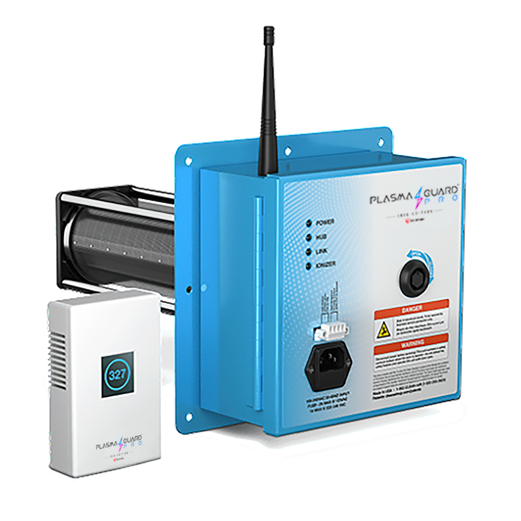 今回発売する「PlasmaGuard PRO™ アイリスエディション」は、米国のプラズマガードLLC社の大規模空気清浄化技術を採用し、空間と物体表面の両方を除菌できます。独自の低温プラズマ放電技術により発生する活性酸素や活性窒素を含む長寿命なイオンにより、菌やウイルスを99.9%除菌します(※2)。また、空調ダクトに本体を取り付けて建物の空調システムと連動することで、1台で最大約840㎥(※3)まで対応可能で、オフィスや大型の商業施設等でも効果が期待できます。さらに、付属のPMセンサーで空気中の微粒子濃度を測定し、スマートハブを通じてクラウド上に測定データを収集します。このデータは、スマートフォンやタブレット、パソコンで確認できるため、目に見えないイオンの効果を可視化します。なお、既設の空調ダクトに直接本体を設置するため、新たな空調設備の入替工事が不要で、施設を長期間閉鎖することなく設置できます。