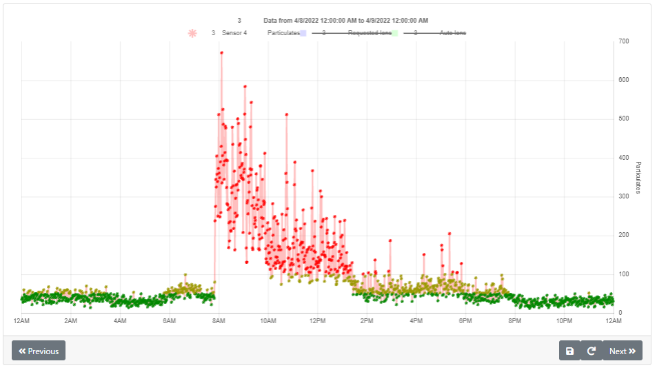 付属のPMセンサーで空気中の微粒子濃度を測定し、スマートハブを通じてクラウド上に測定データを収集します。このデータは、スマートフォンやタブレット、パソコンで確認できるため、目に見えないイオンの効果を可視化します。また、PMセンサーと連動することで、空気中の微粒子濃度に応じた自動運転や空調システムのAHU(エアハンドリングユニット)との動作連動も可能です。