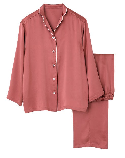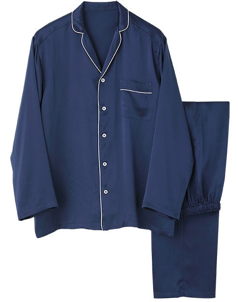 なめらかな肌ざわりと美しい光沢感のある「KAIMIN NAVI」シルク100%サテンパジャマは、吸放湿性に優れ、