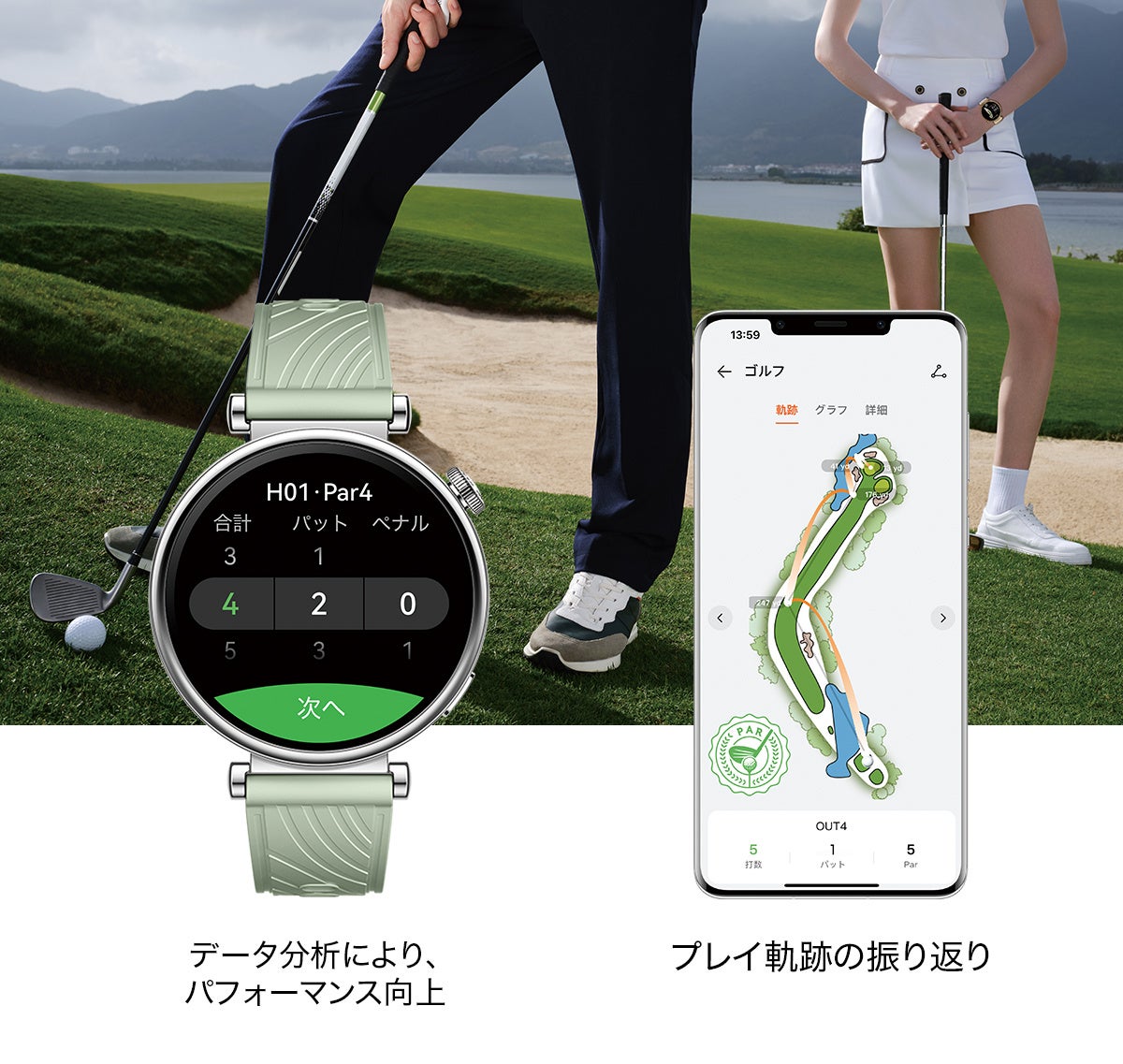 各ホールごとにスコアカードを手動で入れると、ストローク数、平均パット数、フェアウェイキープ率、パーオン率(GIR)などの詳細なプレイデータの統計がウォッチ、スマホアプリから確認できます。スマホアプリ「HUAWEI Health」からは、一打一打の軌跡をアニメーションの形で追跡できる機能もあり、最高のショットを家族や友人に共有することも可能です。もちろんスマートウォッチとして、プレイ中の心拍数や歩数などのデータも常にモニタリングしています。