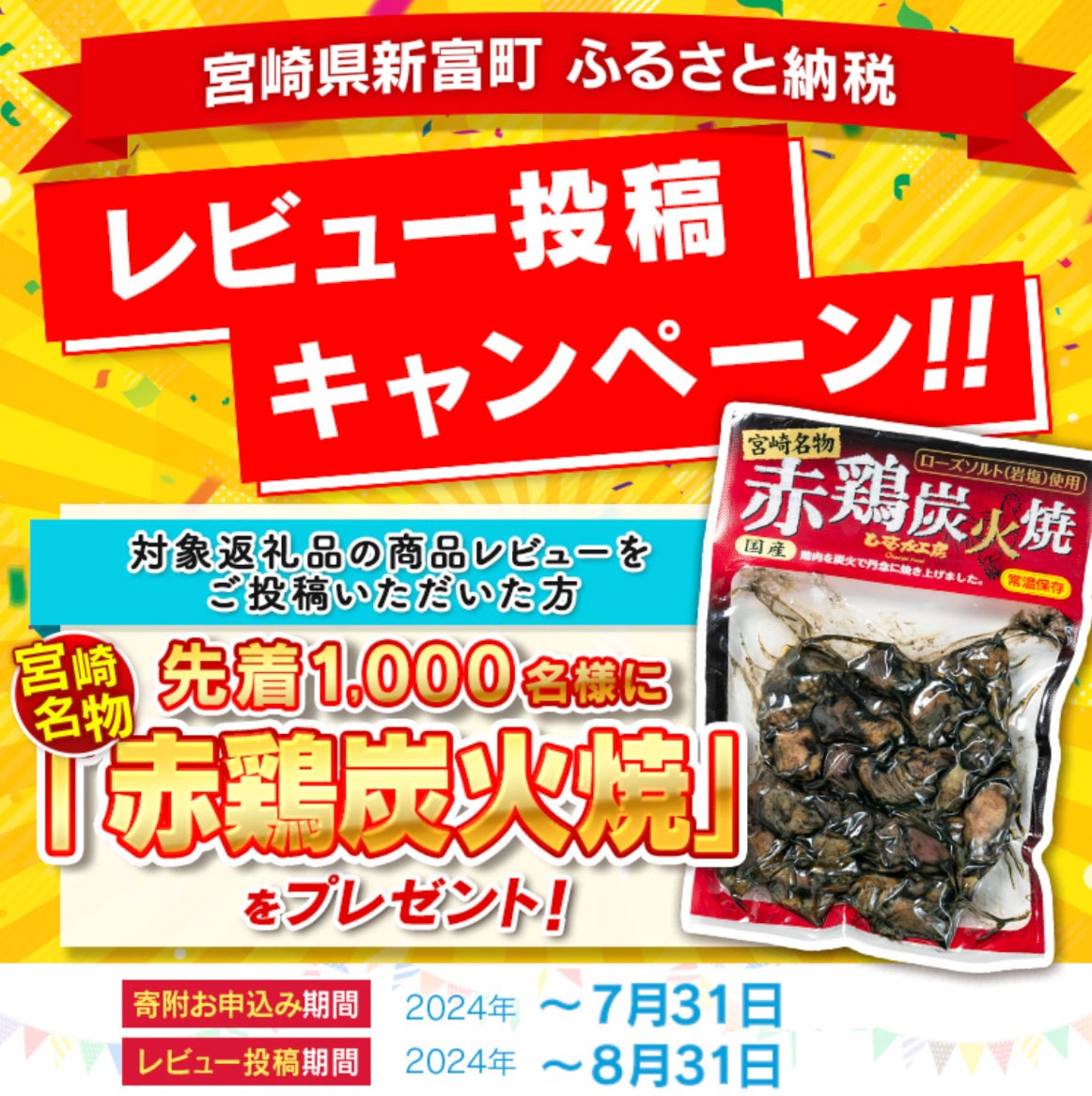 一般財団法人こゆ地域づくり推進機構(宮崎県児湯郡新富町、代表理事:齋藤潤一、以下こゆ財団という)が受託運営する宮崎県新富町ふるさと納税において、レビュー投稿キャンペーンを開催中です。対象返礼品の商品レビューを投稿いただいた先着1000名様に宮崎名物の「赤鶏炭火焼き」のプレゼントをお贈りします。