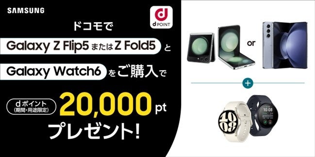 「Galaxy Watch6」と、「Galaxy Z Flip5」(SC-54D)または「Galaxy Z Fold5」 (SC-55D)の256GBを購入期間中にご購入※2いただいたお客様に「dポイント20,000pt(期間・用途限定)」を進呈※3