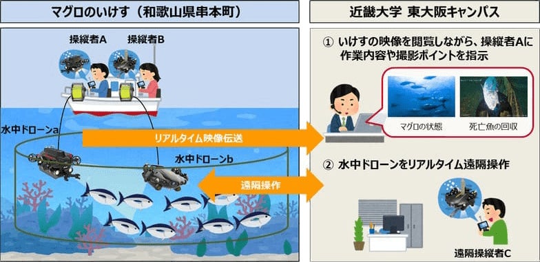当日は、近畿大学、NTTドコモ(以下、ドコモ)が、5Gネットワークを活用し、近畿大学水産研究所 大島実験場いけす内の映像をリアルタイムに伝送、同時に近畿大学 東大阪キャンパスから水中ドローンの遠隔操作を行い、水中ドローンによる完全養殖クロマグロの状態の監視を行いました。