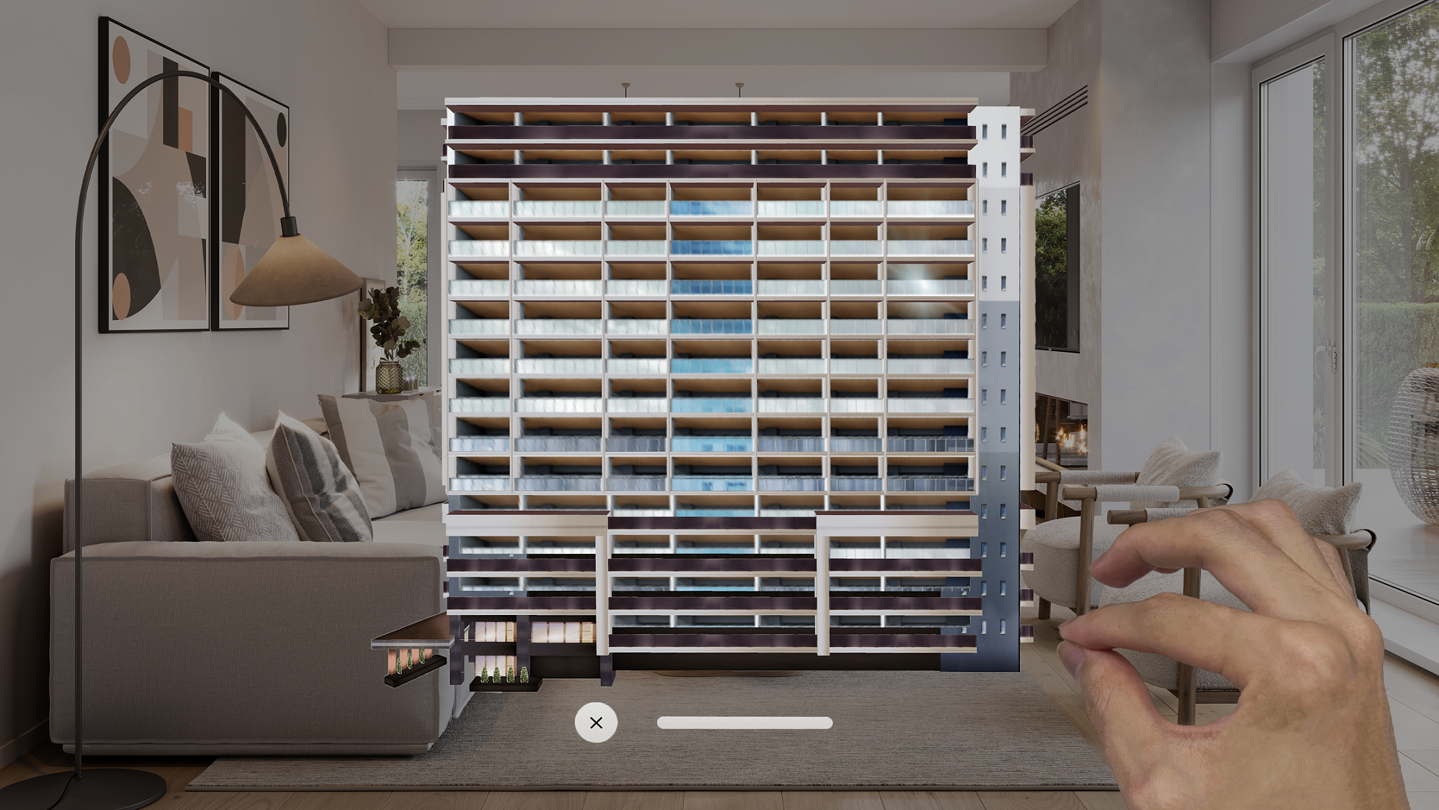 空間全体を表現のキャンバスとして使える空間コンピューティングを活かして、まるでマンションの建物全体や部屋を自分のいる空間にあるように表示します。さらに、視線と手の動きにあわせて自由に拡大縮小や回転することができるので、物件のじっくり見たい箇所の拡大や回転なども直観的に操作できます。