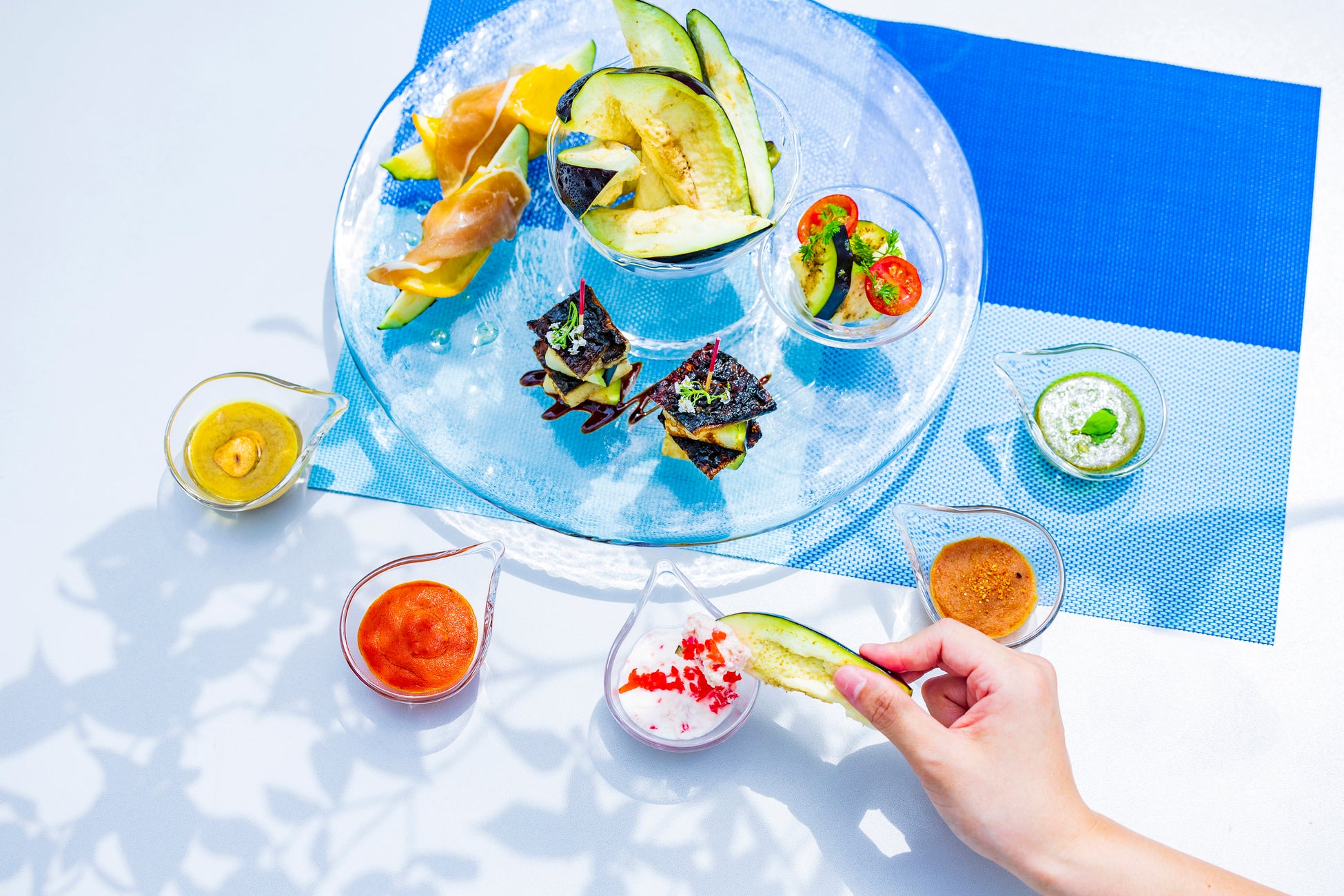 本イベントでは、ビールのお供として、水なすを使用した生水なすのディッププレートを提供します。プレートは、生の水なす丸ごと1個と5種類のディップソース、3種類のアレンジ料理で構成。水なすは90パーセントが水分で占めており、アクが少ないため生食に適した野菜です。また、包丁で切るよりも手で割く方が水分が流れ出ず、より柔らかくなめらかな食感を味わえます。生水なすのディッププレートでは、水なすを丸ごと1個提供するため、割く体験ができ、水なす本来の味わいを堪能できます。水なす本来の味わいを楽しんだ後は、バリエーション豊かな5種類のディップソースにつけて、食べ比べをすることも可能。3種類のアレンジ料理「生ハム水なす」「水なすとうなぎのミルフィーユ」「水なすのカプレーゼ」は、水なすと相性の良い食材を組み合わせているため、それぞれの食材がもたらす香りや味の相乗効果を楽しめます。