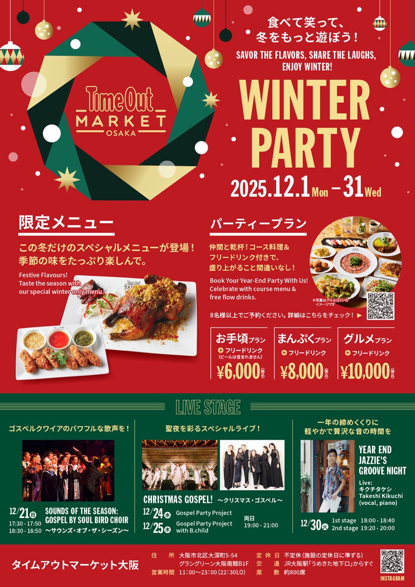 タイムアウトマーケット大阪では、この冬を思いきり楽しむシーズンイベント「WINTER PARTY」を開催します。人気シェフが手がける冬限定メニュー、気の合う仲間と盛り上がれるパーティープラン、そして心が弾むライブステージまで。