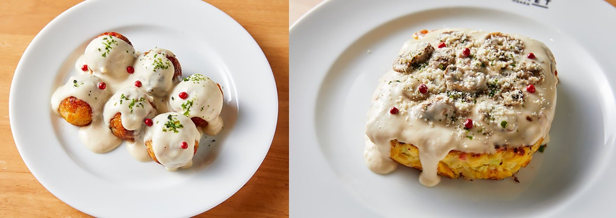 カリッと焼いたたこ焼きに、ポルチーニ香るクリームソースを絡めました。だしの旨みとキノコの風味がやさしく広がります。