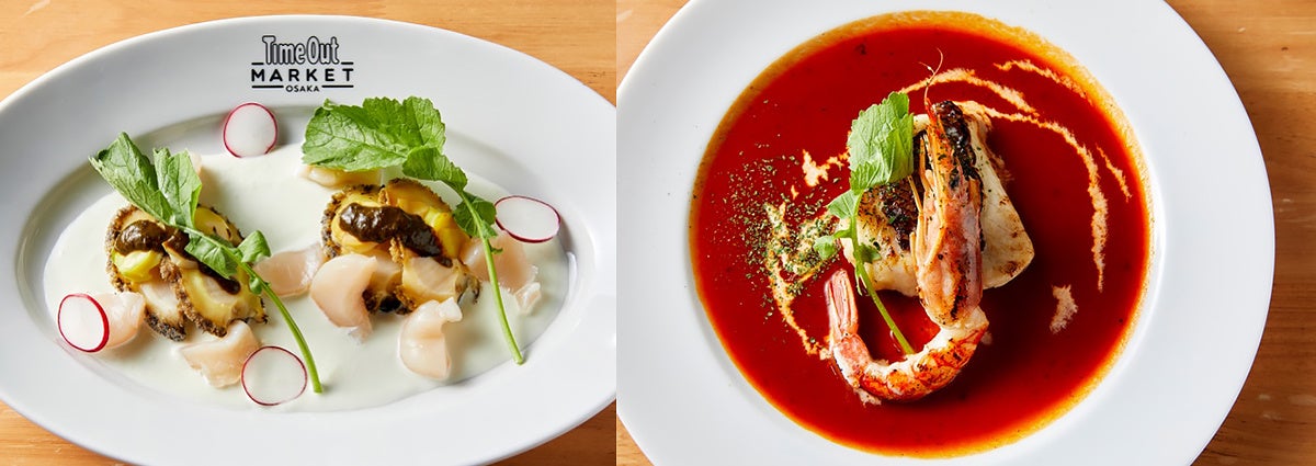 左上/蒸しアワビとホタテ~カブとワサビのホワイトソース~(¥5,000)