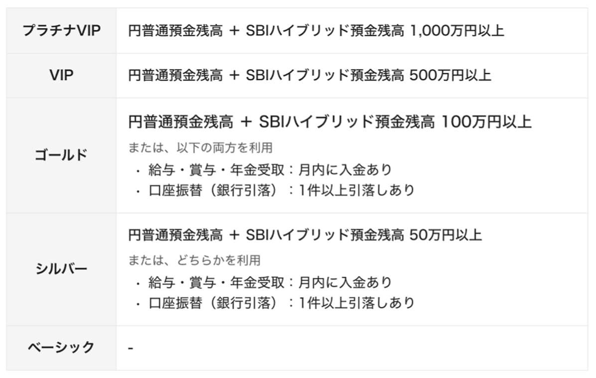 判定対象月の月末時点の「円普通預金残高」および「SBIハイブリッド預金残高」の合計または、判定対象月の給与・賞与・年金受取および口座振替(銀行引落)の利用状況に応じてランクを決定します。なお、ランク名は下記のとおり変更します。