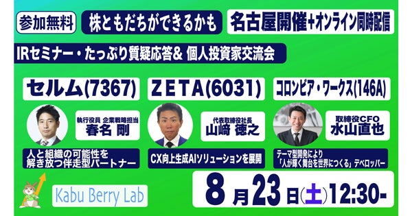 2025年8月23日(土)に名古屋で開催される個人投資家向けIRセミナー「Kabu Berry Lab」に代表取締役社長の山崎が登壇いたします。