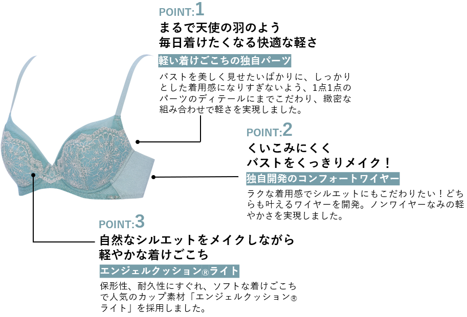開発のコンセプトは「天使のブラⓇ 史上いちばん快適な天使」。天使のブラⓇの特長であるバストメイク力の機能はそのまま、苦しさ・くい込みストレスを軽減。毎日着けたくなる軽いつけごこちにこだわりました。この快適さ、いち早く体感してください!