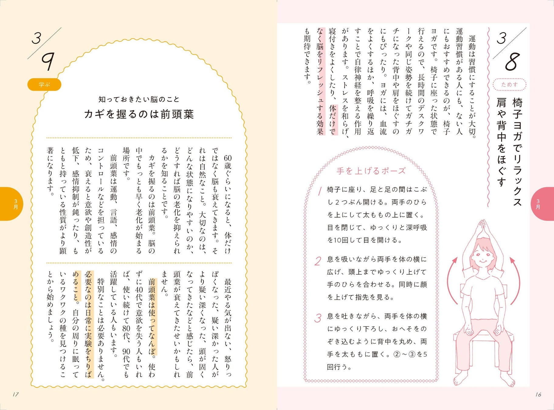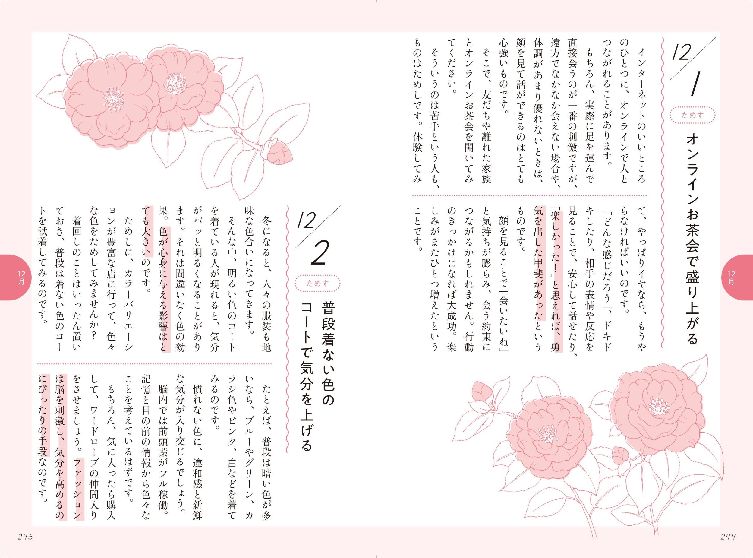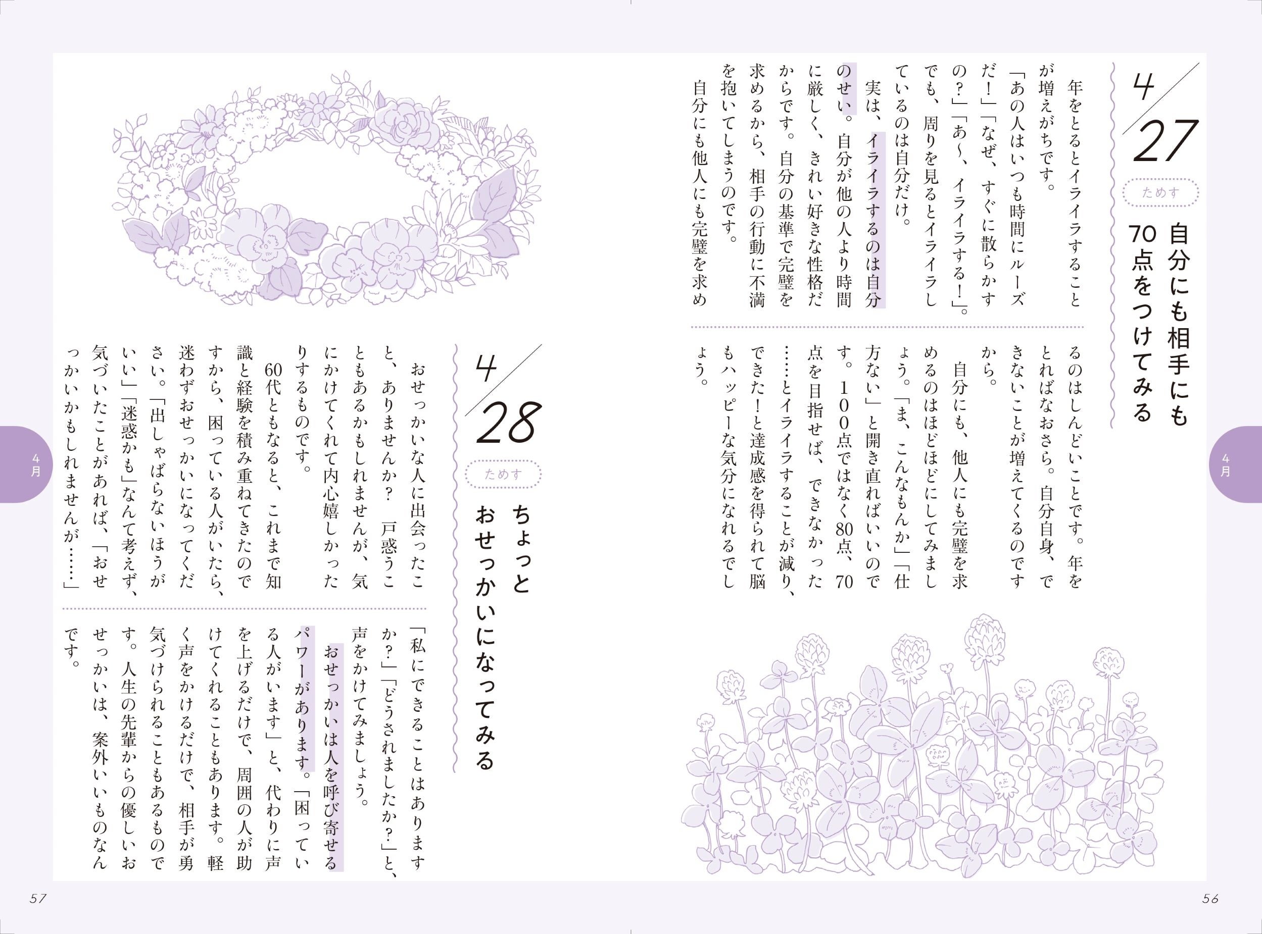 そこで、我慢しないで、思いっきり自由に楽しんでいただくため、本書では、日々「ためしたいこと」を、春夏秋冬、1年分提案することにしました。本書は「毎日楽しみながら生きる人はずっと元気でいられる」をコンセプトに、「老けないためのさまざまな方法」を365日のフォーマットで紹介する1冊です。