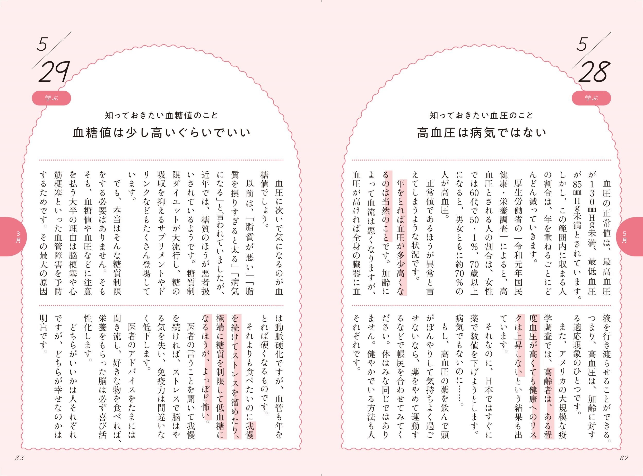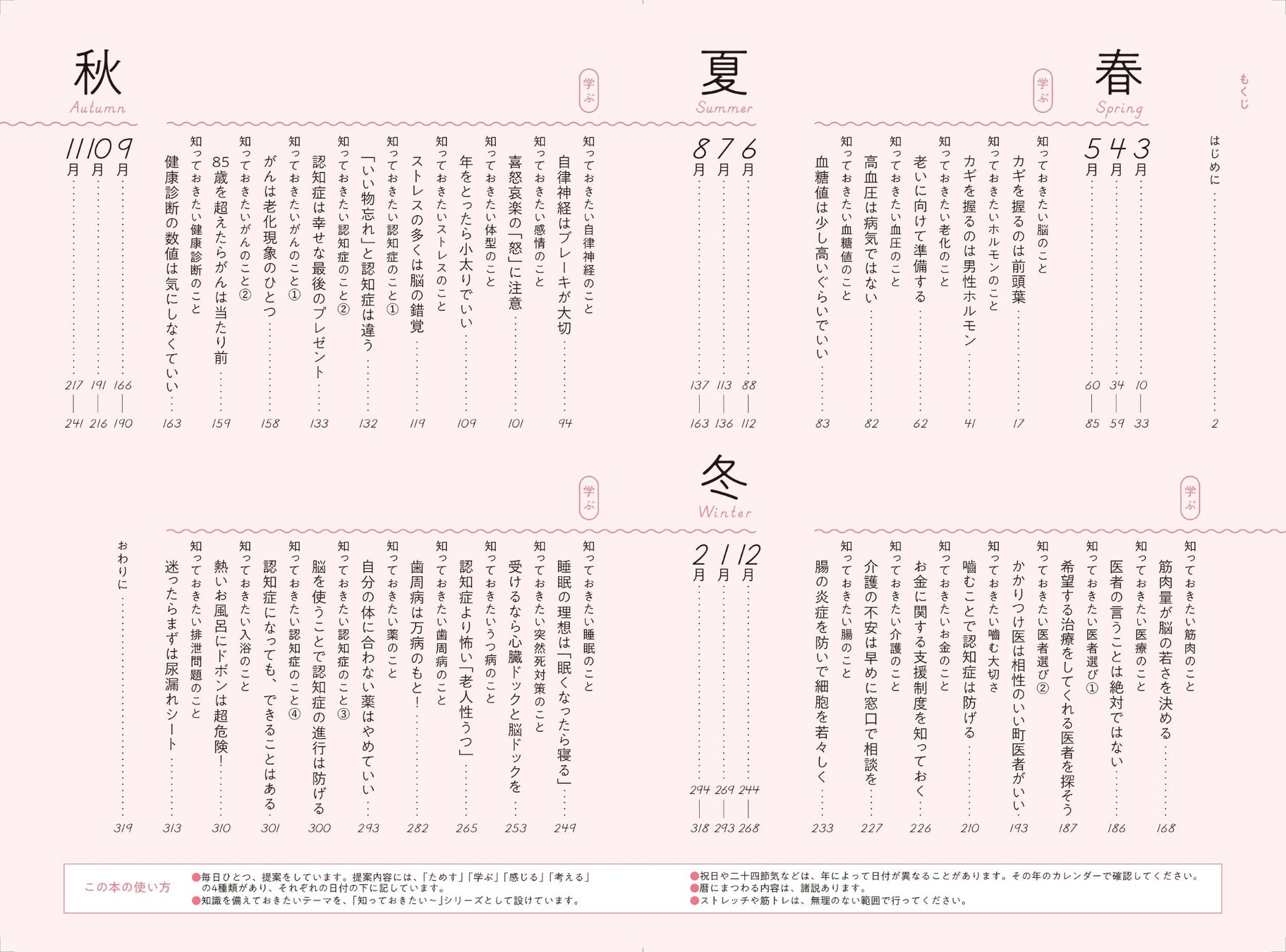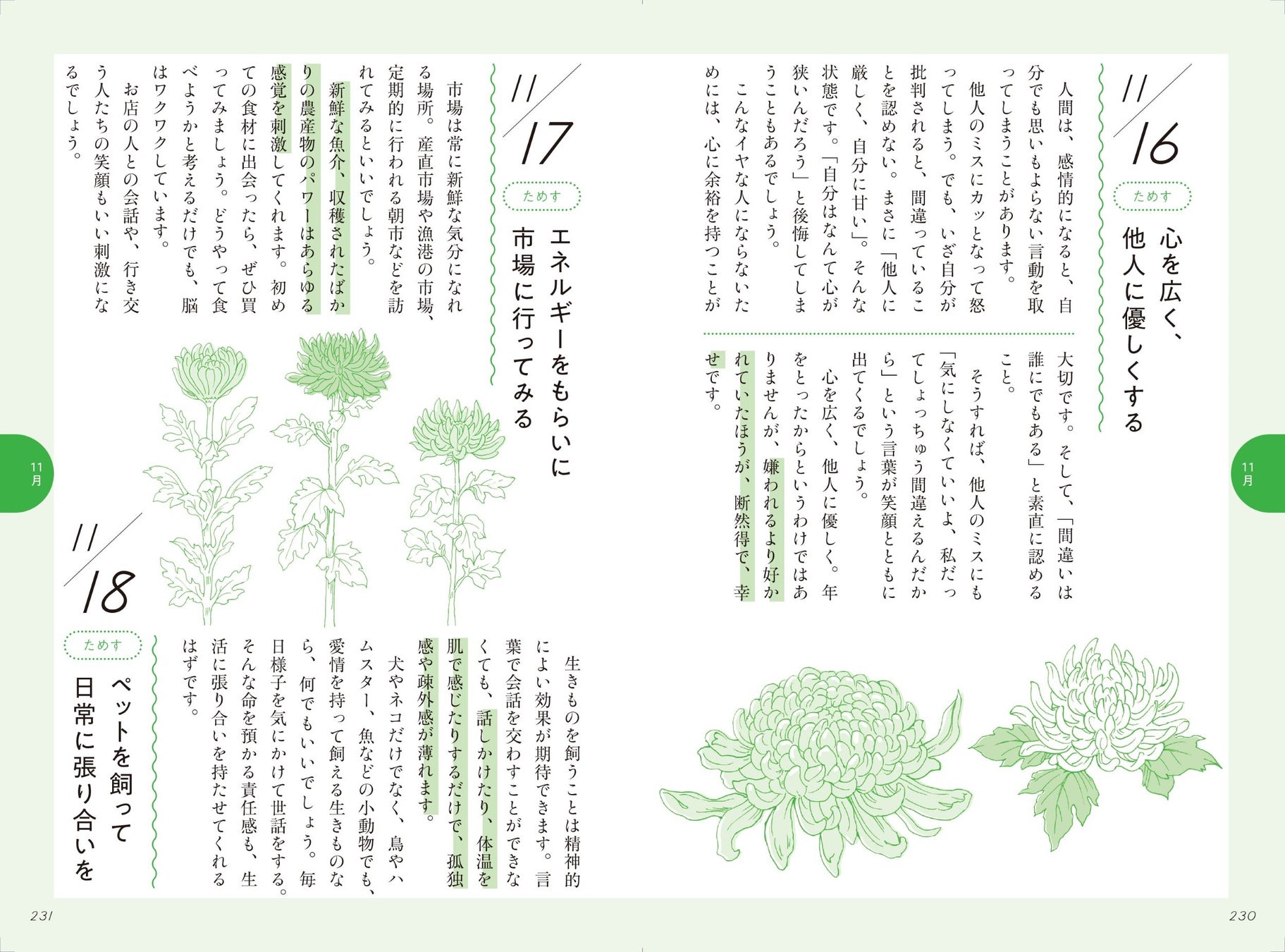 そこで、我慢しないで、思いっきり自由に楽しんでいただくため、本書では、日々「ためしたいこと」を、春夏秋冬、1年分提案することにしました。本書は「毎日楽しみながら生きる人はずっと元気でいられる」をコンセプトに、「老けないためのさまざまな方法」を365日のフォーマットで紹介する1冊です。