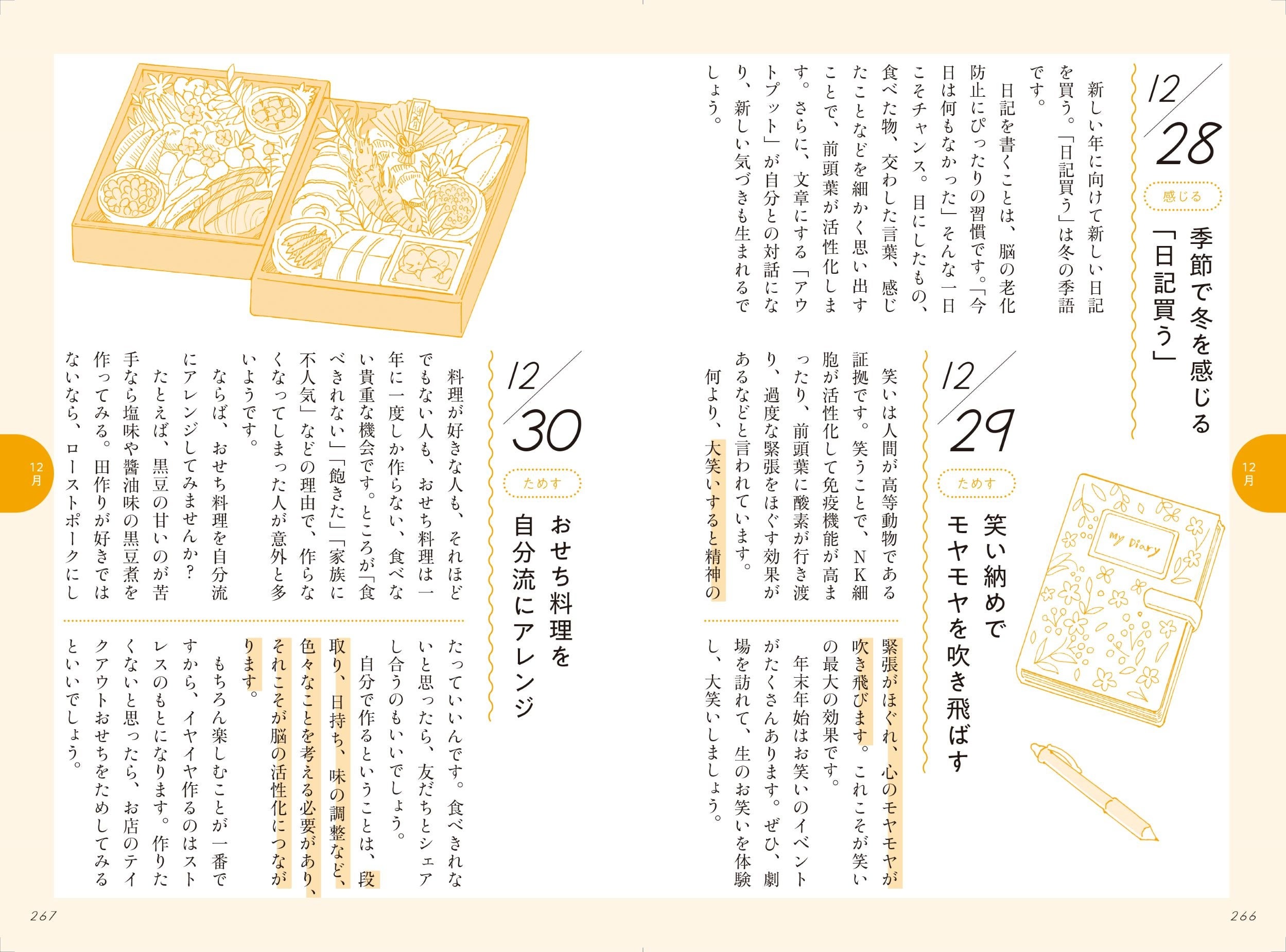 異名をとるならば「365日の前頭葉活性化のための暮らし事典」のような使い方もよいでしょう。気軽に明日の一歩をトライするヒントにしていただければ幸いです。